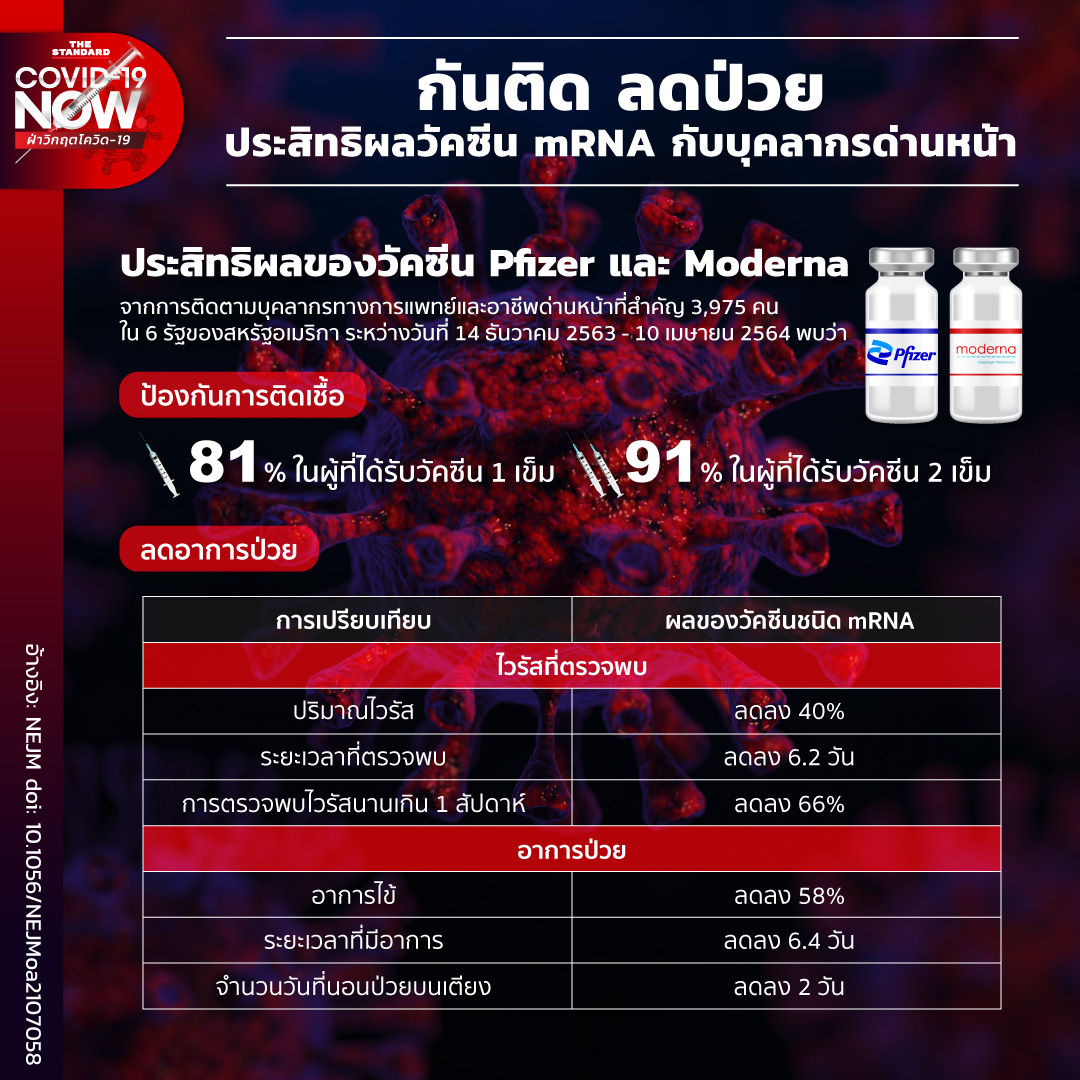 THE STANDARD เคยนำเสนอข้อมูลเกี่ยวกับสายพันธุ์เดลตาและประสิทธิภาพของวัคซีนต่อสายพันธุ์นี้เมื่อสัปดาห์ก่อน ครั้งนี้จึงขอหยิบยกงานวิจัยประสิทธิผลของวัคซีนในบุคลากรทางการแพทย์ กู้ชีพ/กู้ภัย และอาชีพด่านหน้าที่สัมผัสใกล้ชิดผู้อื่นมาพูดถึงบ้าง โดยเป็นงานวิจัยเกี่ยวกับการป้องกันและการลดอาการป่วยจากโควิดด้วยวัคซีนชนิด mRNA 2 ยี่ห้อคือ Pfizer และ Moderna