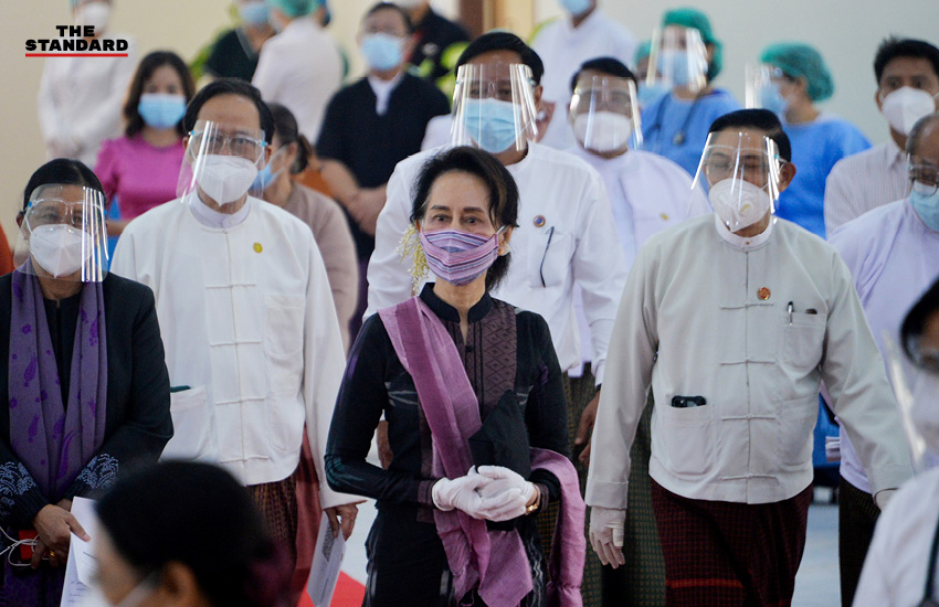 ออง ซาน ซูจี ที่ปรึกษาประเทศเมียนมา เยี่ยมชมการฉีดวัคซีนต้านโควิด-19 ให้กับบรรดาพี่น้องประชาชนที่โรงพยาบาลในกรุงเนปิดอว์ เมื่อวันวันที่ 27 มกราคมที่ผ่านมา ก่อนที่จะถูกกองทัพควบคุมตัว