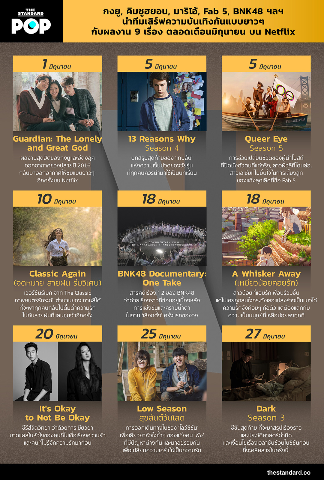 THE STANDARD POP ได้ลิสต์ 9 ผลงานทั้งเก่าและใหม่ ที่เตรียมเสิร์ฟความบันเทิงบน Netflix นำทัพโดย กงยู, แก๊ง Fab 5, มาริโอ้ เมาเร่อ และ BNK48 กันแบบยาวๆ ตลอดเดือนมิถุนายนนี้