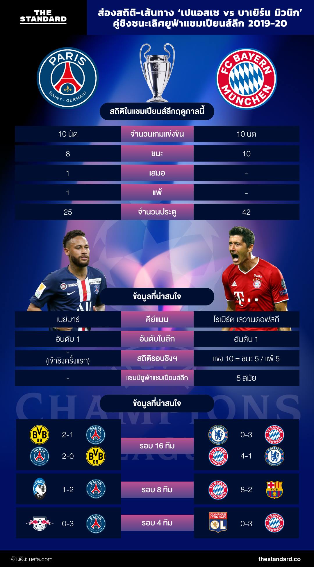 - เนย์มาร์มีสถิติในการเล่นกับบาเยิร์นดีไม่น้อย โดยเคยทำไปแล้วถึง 4 ประตูในการเจอสุดยอดทีมจากเยอรมนี (กับทุกสโมสร) มีเพียงแค่กลาสโกว์ เซลติก และเปแอสเชเท่านั้นที่เขายิงประตูใส่ได้มากกว่า (7 ประตู)