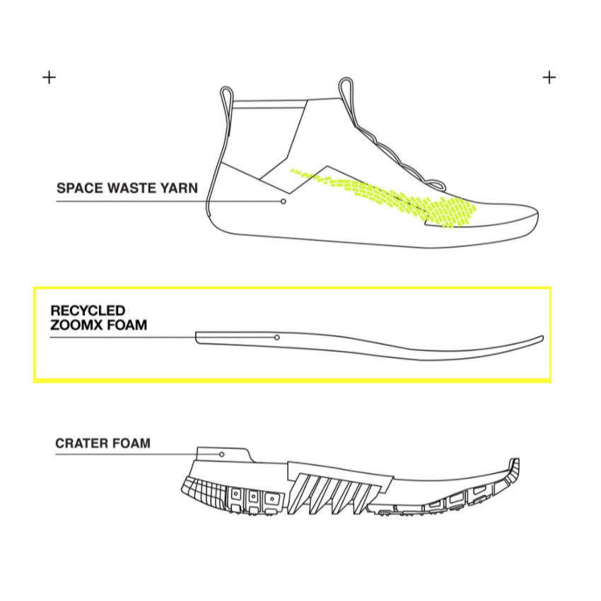ความพิเศษของรองเท้าคู่นี้ได้แก่การเป็นคอลเล็กชันรองเท้า ที่ผลิตขึ้นจากเศษวัสดุเหลือทิ้งในโรงงานผลิตของไนกี้ ซึ่งเหล่าพนักงานได้ตั้งชื่อให้ขยะเหล่านี้ว่า ‘ขยะอวกาศ’ หรือ Space Junk แต่เมื่อโปรเจกต์นี้ได้ถือกำเนิดขึ้น ทางทีมออกแบบจึงนำเศษวัสดุเหล่านั้นมารีไซเคิล เพื่อก่อให้เกิดสิ่งใหม่ที่มีคุณค่ามากกว่า ภายใต้แนวความคิดเรื่องการพัฒนาผลิตภัณฑ์ โดยการใช้ทรัพยากรหมุนเวียนอย่างครบวงจร (Circular Design) ที่เริ่มตั้งแต่การเลือกวัสดุให้น้อยที่สุดเพื่อสร้างประโยชน์สูงสุด ผ่านกระบวนการผลิตที่ใช้พลังงานระดับต่ำ และการออกแบบกล่องใส่รองเท้าที่ส่งผลกระทบต่อสิ่งแวดล้อมน้อยที่สุด จนได้มาเป็นรองเท้าผ้าใบที่สามารถ ‘ลดการสร้างคาร์บอนฟุตพรินต์ได้ในระดับต่ำที่สุด’ เท่าที่ไนกี้เคยทำมา