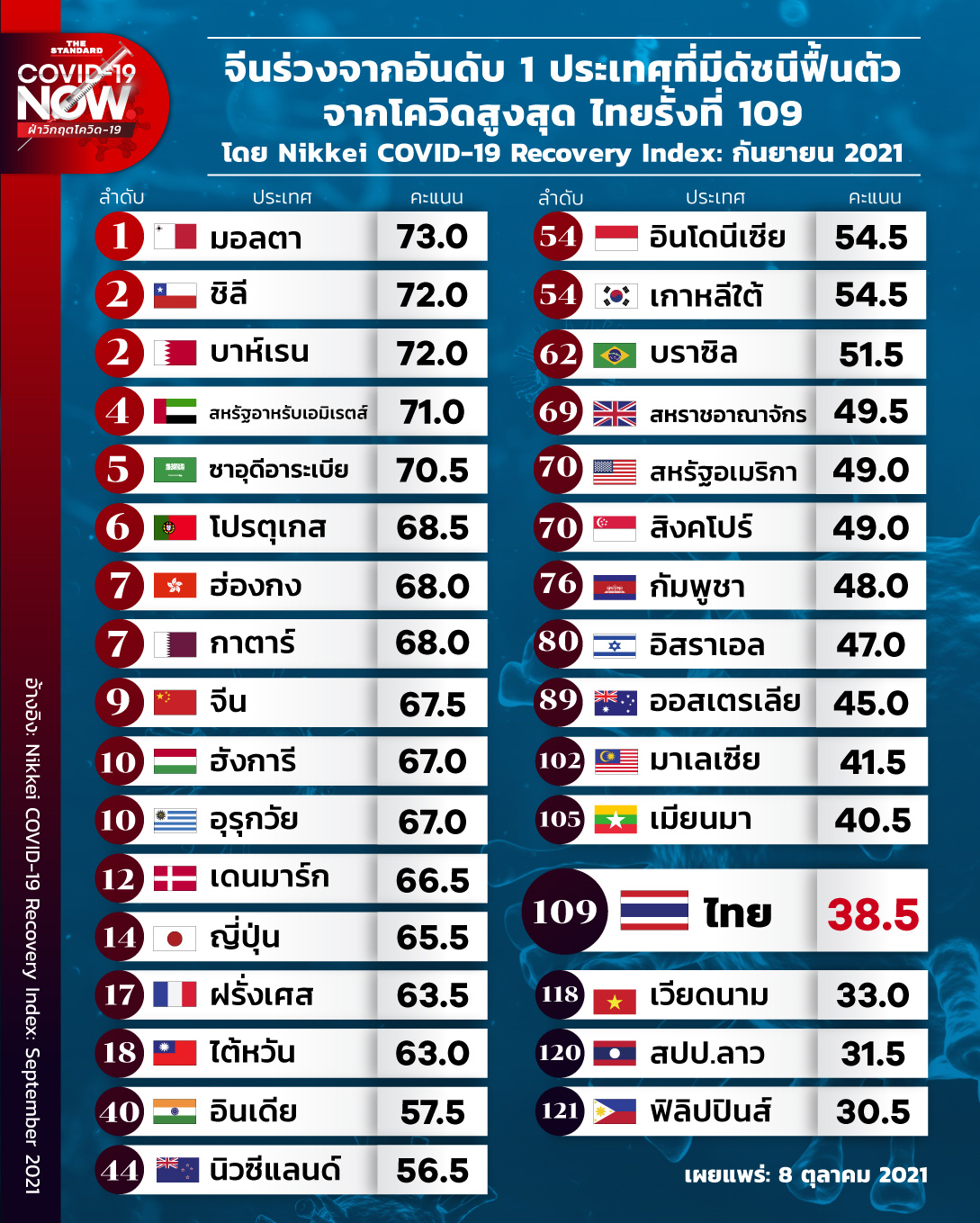 วันนี้ (8 ตุลาคม) Nikkei สำรวจและจัดอันดับประเทศและดินแดนกว่า 120 แห่งทั่วโลก ด้วยดัชนี COVID-19 Recovery Index เพื่อวัดขีดความสามารถใน 1. การบริหารจัดการวิกฤตโรคระบาด (Infection Management) 2. การฉีดวัคซีน (Vaccination) และ 3. ความสามารถในการเคลื่อนตัวของสังคม (Mobility) ในช่วงปลายเดือนของทุกๆ เดือน คำนวณคะแนนจาก 0-90 ซึ่งวัดจาก 3 หมวดหลักข้างต้น โดยมีดัชนีรวม 9 หมวดย่อย เช่น จำนวนผู้ติดเชื้อต่อประชากร การตรวจเชื้อต่อจำนวนเคส ปริมาณวัคซีนรวมที่ได้รับต่อหัว สัดส่วนของประชาชนที่ได้รับวัคซีนอย่างน้อย 1 โดส เป็นต้น