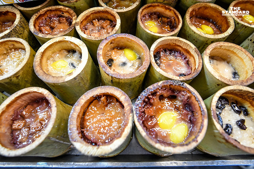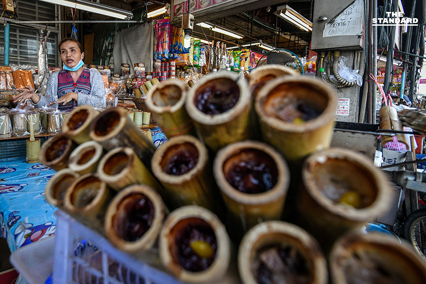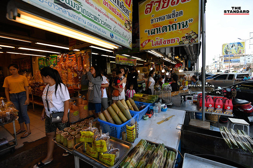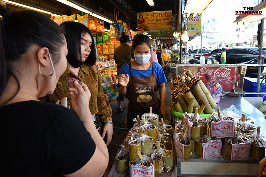 THE STANDARD ลงพื้นที่สำรวจตลาดหนองมน ซึ่งส่วนใหญ่เป็นร้านจำหน่ายข้าวหลาม คำนวณด้วยสายตาคาดว่ามีจำนวนหลักร้อยกว่าร้าน ซึ่งแต่ละร้านมีเอกลักษณ์ที่แตกต่างกันไป เมื่อสอบถามถึงบรรยากาศการค้าขายในช่วงนี้ ได้คำตอบจากเจ้าของร้านรายหนึ่งว่า