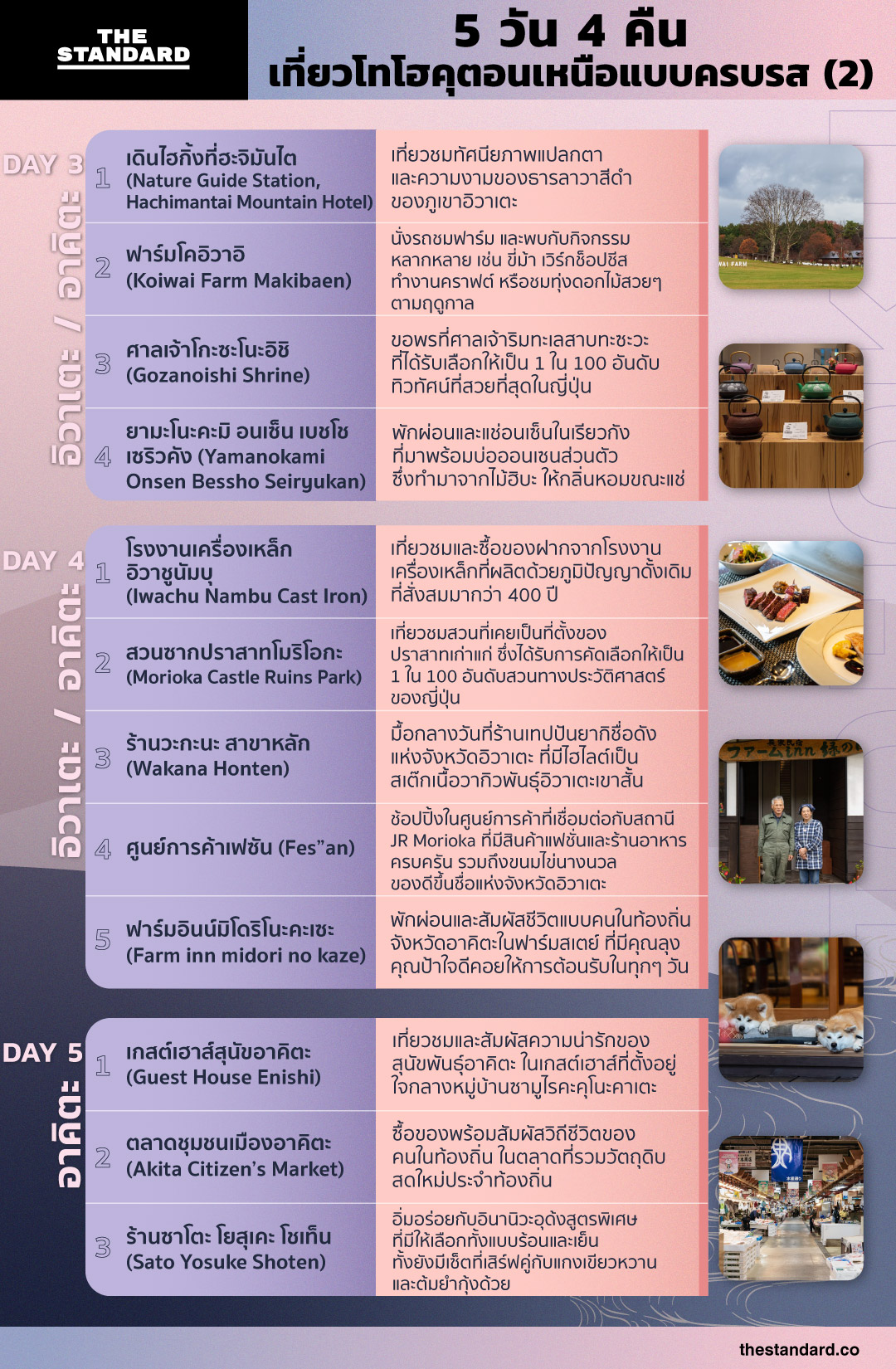 สำหรับใครที่เริ่มสนใจ อยากทำความรู้จักภูมิภาคโทโฮคุให้มากขึ้น แต่ยังไม่รู้ว่าควรจะออกแบบเส้นทางท่องเที่ยวอย่างไรดี อาจจะเริ่มต้นง่ายๆ ด้วยการเที่ยวตามคำแนะนำของคุณโนโซมิ ซึ่งเธอได้ออกเดินทางไปเที่ยวใน 3 จังหวัดของโทโฮคุตอนเหนือเมื่อปลายปีที่ผ่านมา ทริปนี้เธอใช้เวลาทั้งหมด 5 วัน 4 คืน และสามารถเก็บเกี่ยวประสบการณ์ดีๆ จากโทโฮคุได้แบบครบทุกรสชาติเลยทีเดียว