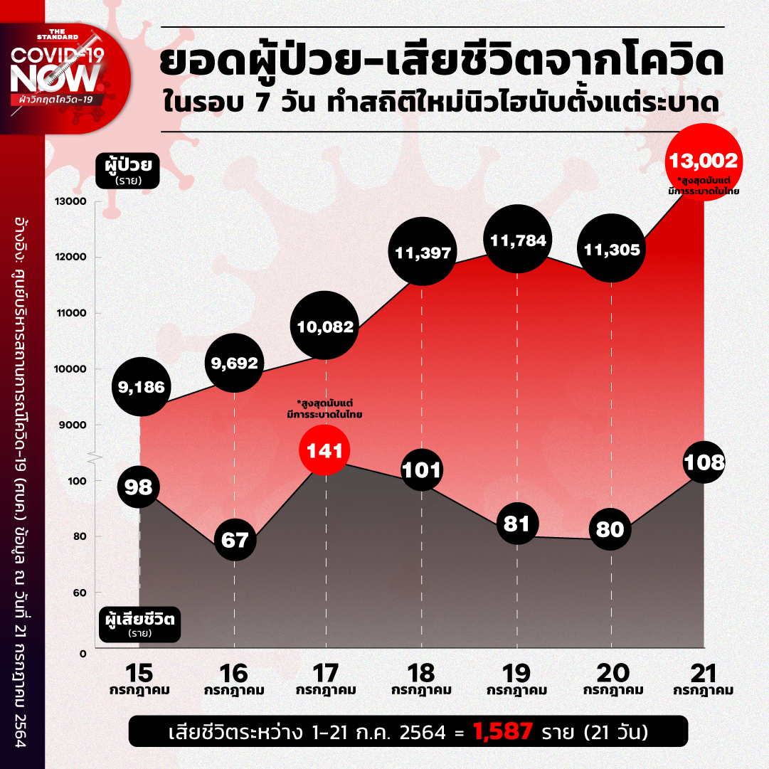 แต่เฉพาะวันที่ 21 กรกฎาคม มียอดผู้ติดเชื้อ 13,002 ราย เสียชีวิตรายวันสะสมอยู่ที่ 108 ราย นับเป็นสถิติตัวเลขผู้ป่วยรายวันสูงที่สุดนับตั้งแต่มีการระบาดของประเทศไทย