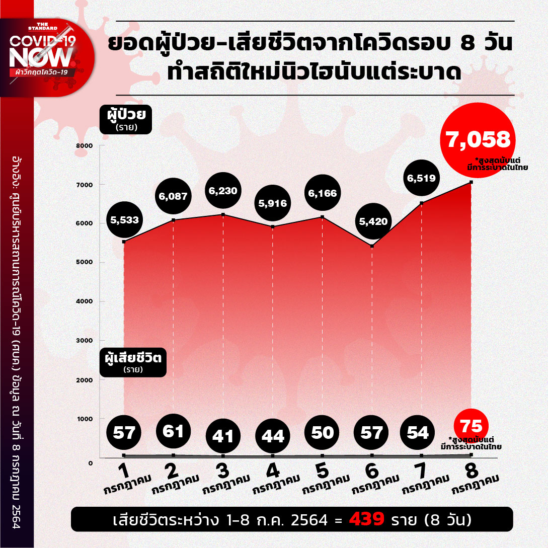 แต่เฉพาะวันที่ 8 กรกฎาคม มียอดผู้ติดเชื้อ 7,058 ราย เสียชีวิตรายวันสะสมอยู่ที่ 75 ราย นับเป็นสถิติตัวเลขผู้ติดเชื้อ และผู้เสียชีวิตรายวันสูงที่สุดในการระบาดของประเทศไทย