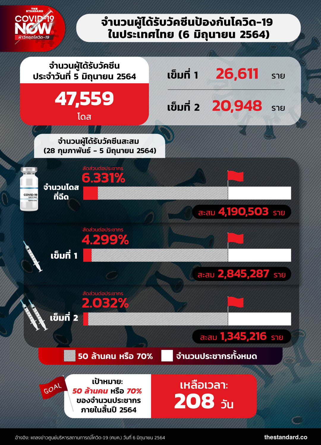 วันนี้ (6 มิถุนายน) ศูนย์บริหารสถานการณ์โควิด-19 (ศบค.) รายงานจำนวนผู้ได้รับวัคซีนป้องกันโควิด-19 ประจำวัน รวม 47,559 โดส แบ่งเป็นเข็มที่ 1 จำนวน 26,611 ราย และเข็มที่ 2 จำนวน 20,948 ราย