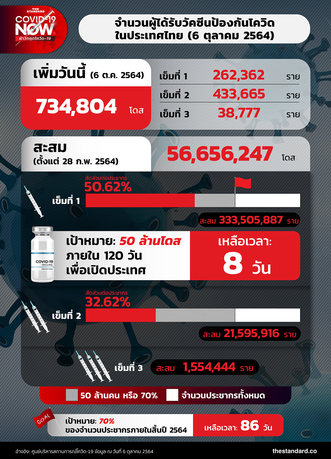 โดยมีผู้ได้รับวัคซีนสะสมทั้งหมด 56,656,247 โดส แบ่งเป็น