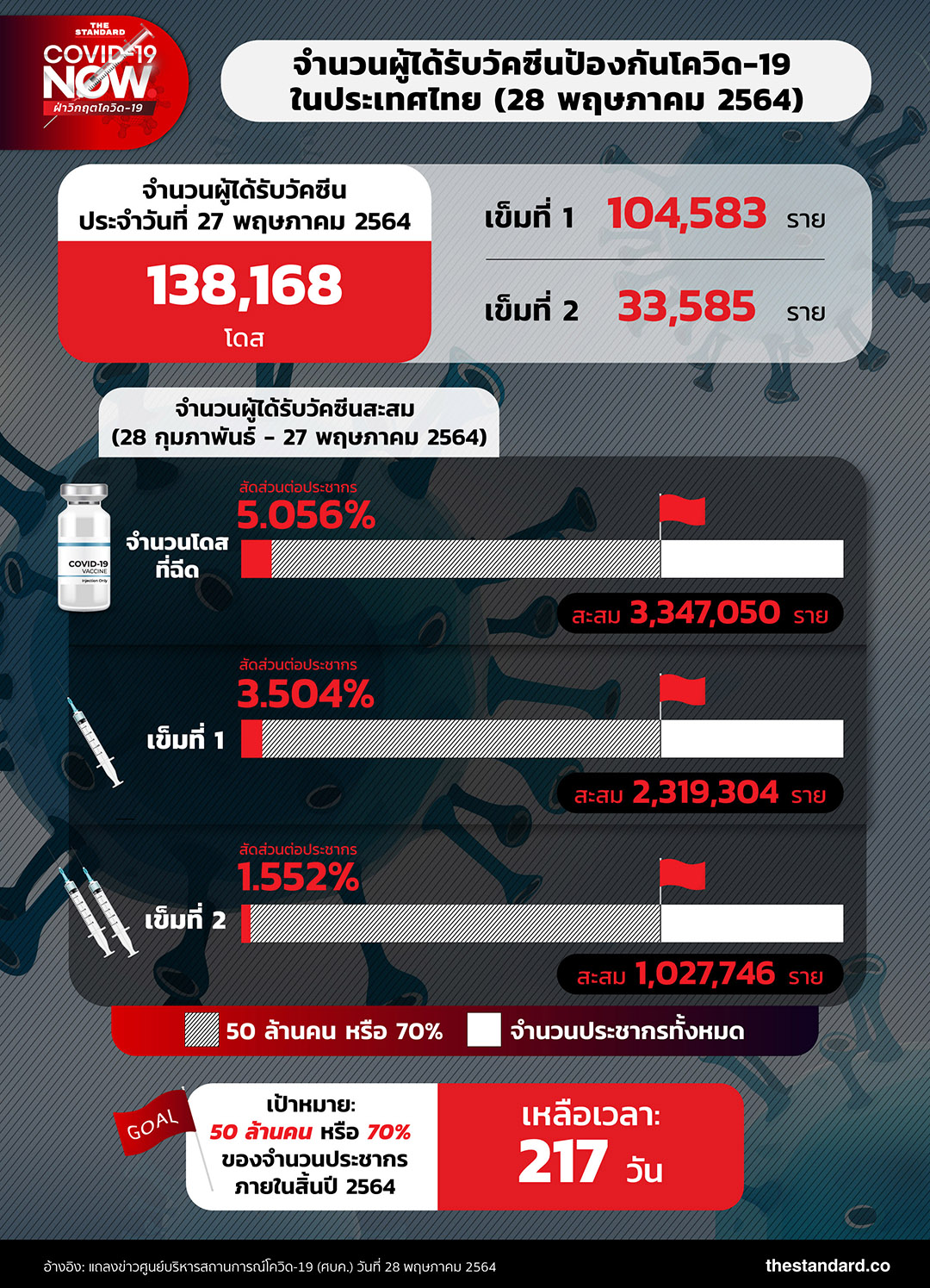 วันนี้ (28 พฤษภาคม) ศูนย์บริหารสถานการณ์โควิด-19 (ศบค.) รายงานจำนวนผู้ได้รับวัคซีนป้องกันโควิด-19 ประจำวัน รวม 138,168 โดส แบ่งเป็นเข็มที่ 1 จำนวน 104,583 ราย และเข็มที่ 2 จำนวน 33,585 ราย
