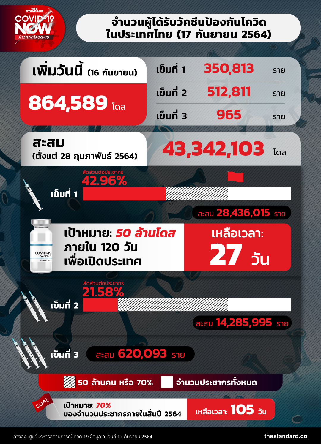 วันนี้ (17 กันยายน) ศูนย์บริหารสถานการณ์โควิด-19 (ศบค.) รายงานจำนวนผู้ได้รับวัคซีนโควิดประจำวัน รวม 864,589 โดส แบ่งเป็น