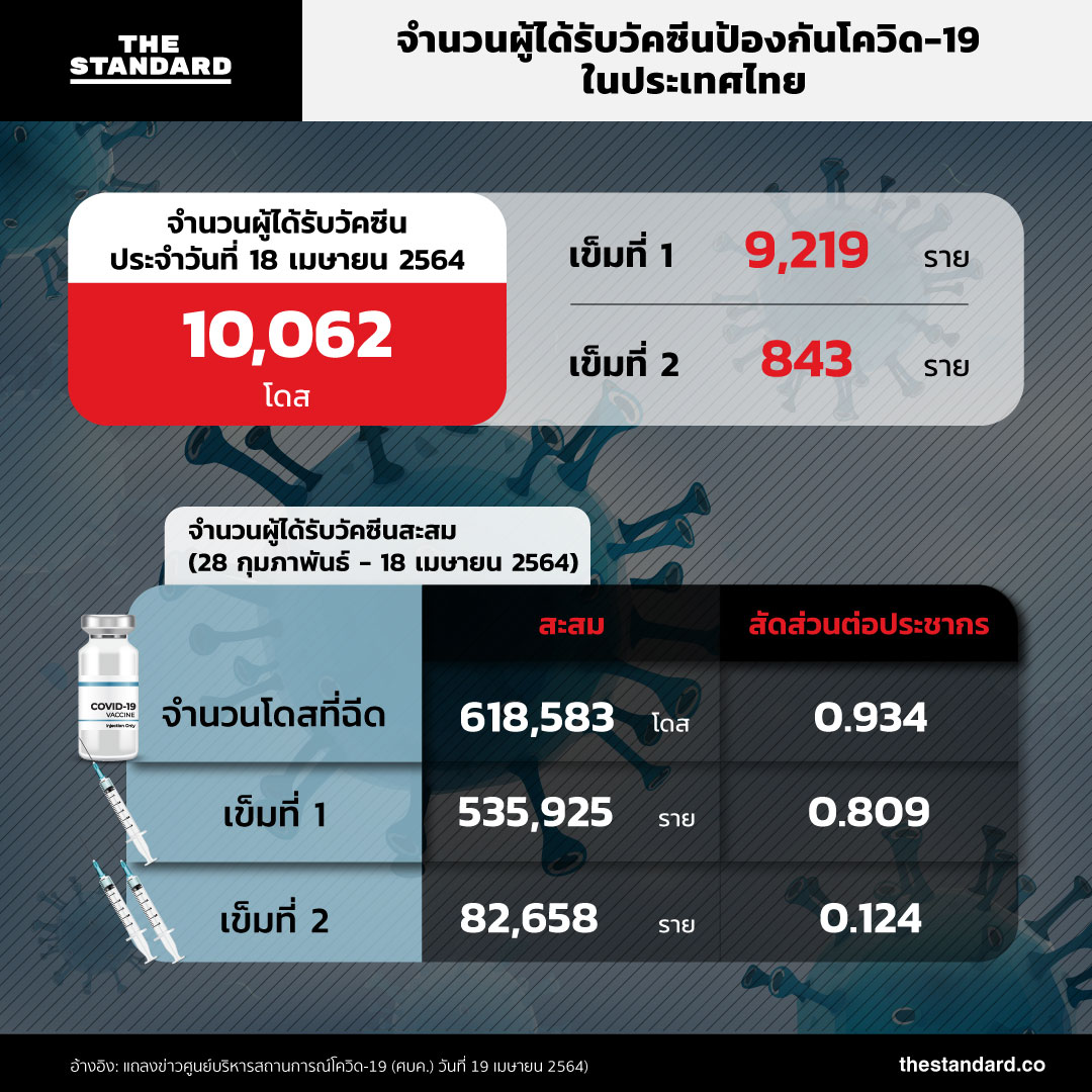 วันนี้ (19 เมษายน) ศูนย์บริหารสถานการณ์โควิด-19 (ศบค.) รายงานจำนวนผู้ได้รับวัคซีนโควิด-19 ประจำวัน รวม 10,062 โดส แบ่งเป็นเข็มที่ 1 จำนวน 9,219 ราย และเข็มที่ 2 จำนวน 843 ราย