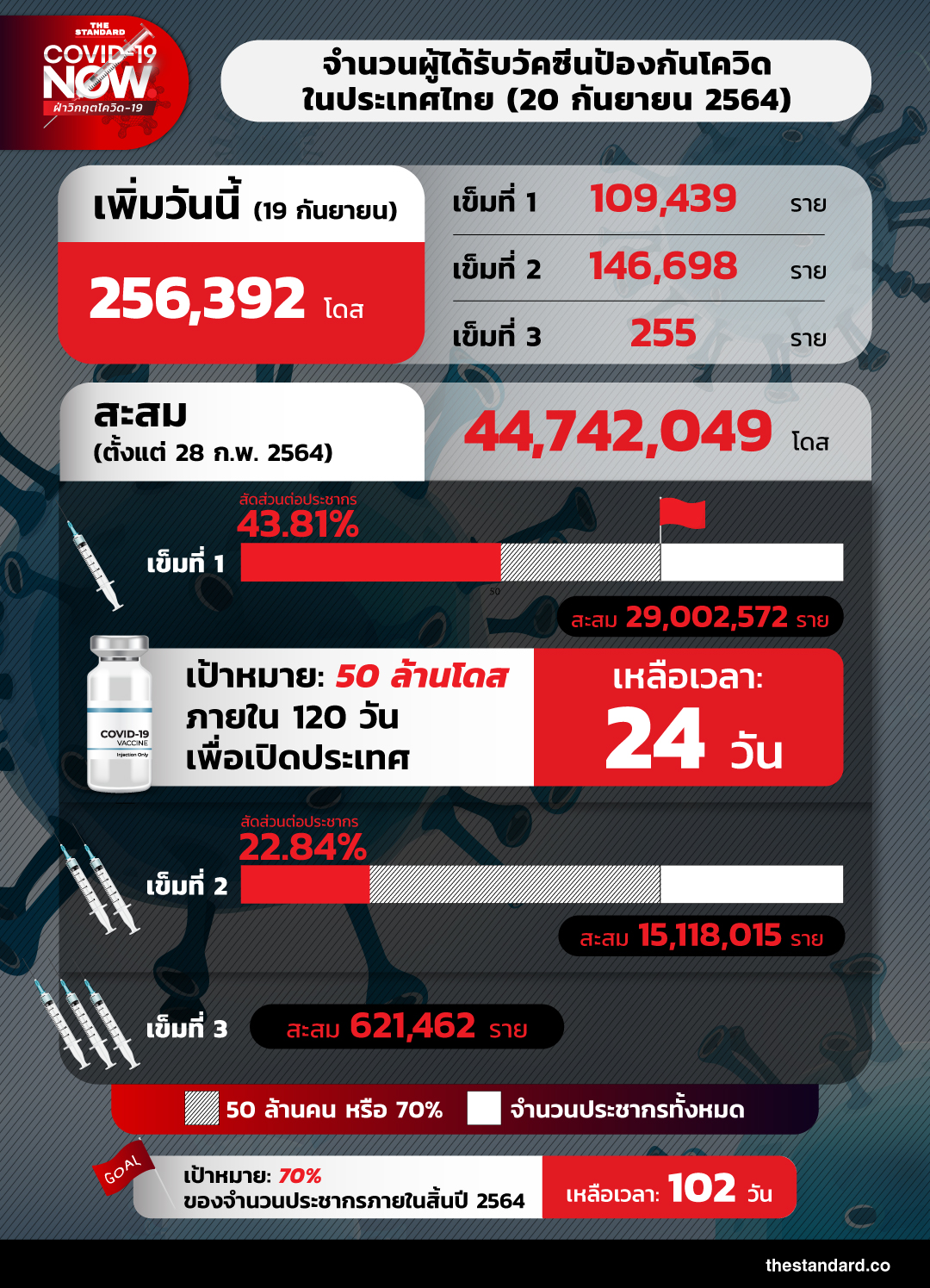 วันนี้ (20 กันยายน) ศูนย์บริหารสถานการณ์โควิด-19 (ศบค.) รายงานจำนวนผู้ได้รับวัคซีนโควิดประจำวัน รวม 256,392 โดส แบ่งเป็น
