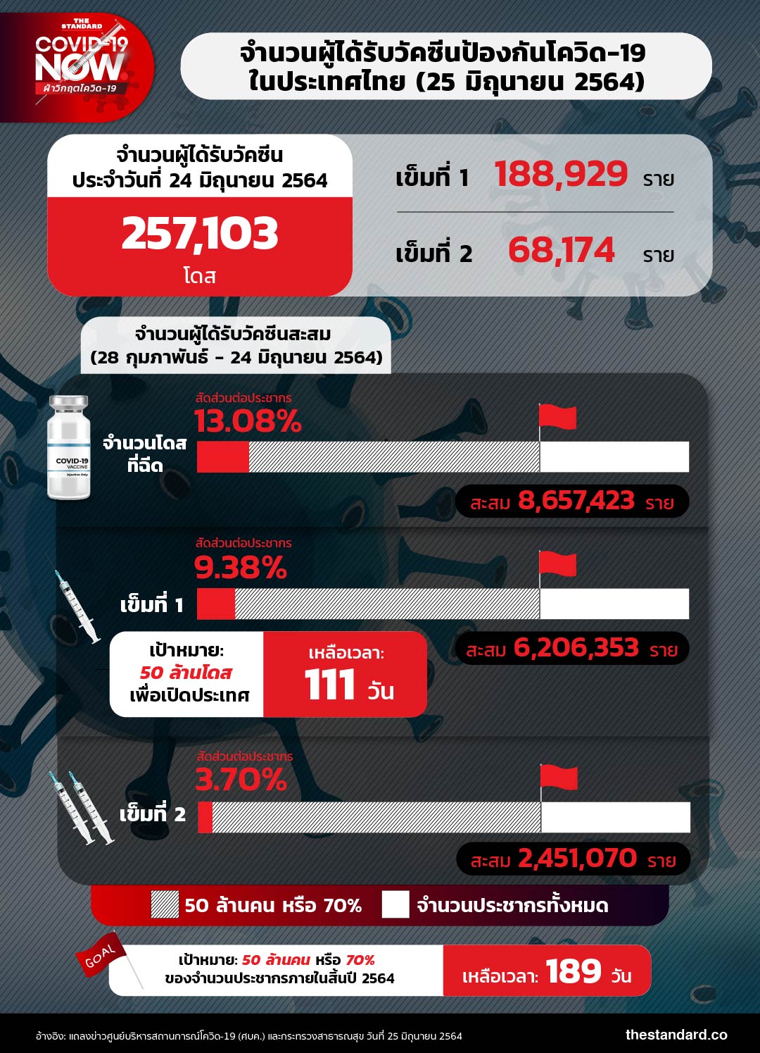 วันนี้ (25 มิถุนายน) ศูนย์บริหารสถานการณ์โควิด-19 (ศบค.) รายงานจำนวนผู้ได้รับวัคซีนโควิด-19 ประจำวันรวม 257,103 โดส แบ่งเป็นเข็มที่ 1 จำนวน 188,929 ราย และเข็มที่ 2 จำนวน 68,174 ราย
