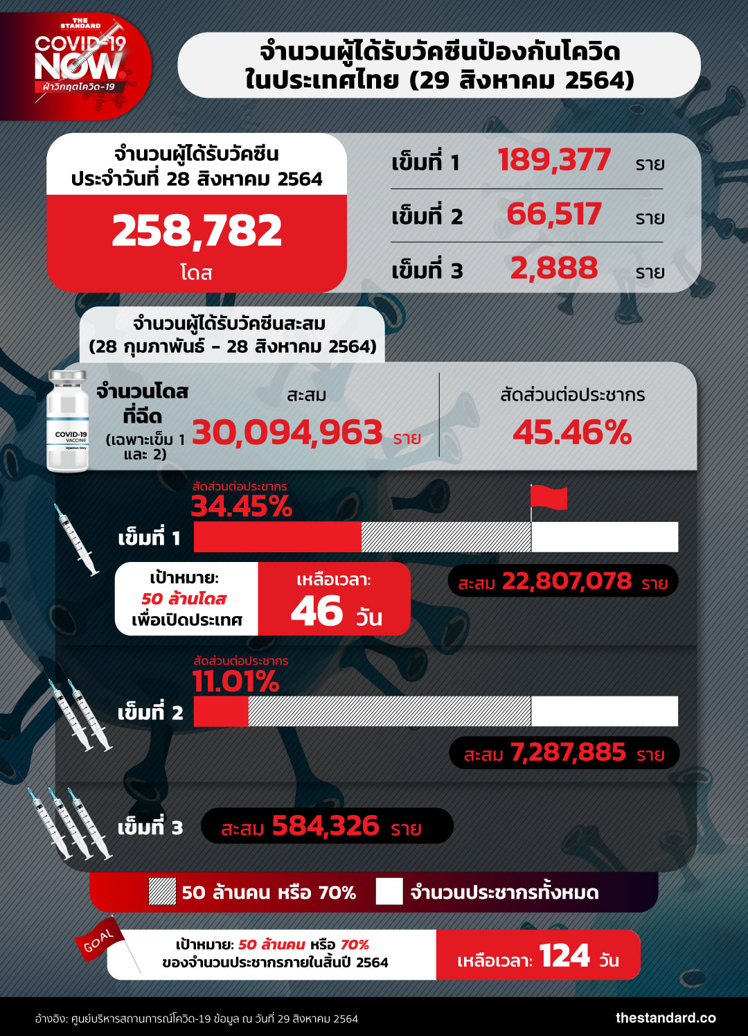 วันนี้ (29 สิงหาคม) ศูนย์บริหารสถานการณ์โควิด-19 (ศบค.) รายงานจำนวนผู้ได้รับวัคซีนโควิดประจำวัน รวม 258,782 โดส แบ่งเป็น
