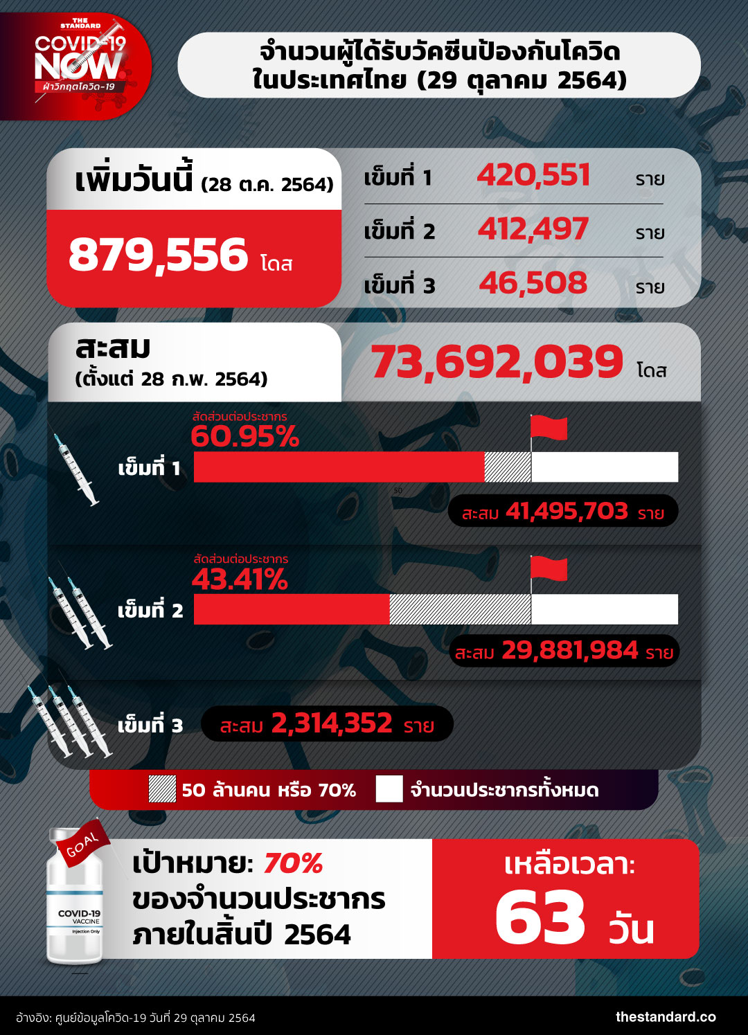 วันนี้ (29 ตุลาคม) ศูนย์บริหารสถานการณ์โควิด-19 (ศบค.) รายงานจำนวนผู้ได้รับวัคซีนโควิดประจำวัน รวม 879,556 โดส แบ่งเป็น