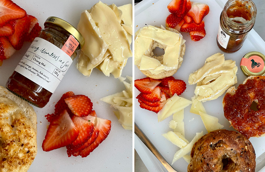 Wild Nature Artisan เคยร่วมงานกับเชฟแอนดี้ก่อนหน้านี้ ด้วยการปรุงสูตรแยมที่ใช้สตรอว์เบอร์รีไทยเป็นส่วนผสมหลักออกมาในชื่อ ‘สายรุ้ง’ ซึ่งในการคอลลาบอเรชันครั้งนี้ แยมสายรุ้งจะใช้เป็นส่วนผสมหลักของไส้ เสริมด้วยกรูแยร์ชีสและสตรอว์เบอร์รีสหรัฐฯ สดหั่นฝาน เชฟแอนดี้เล่าเสริมว่า แยมสายรุ้งจาก Wild Nature Artisan เป็นแยมที่กินกับชีสแล้วเข้ากันได้ดีมากๆ ซึ่งคุณสามารถเลือกให้ไส้นี้อยู่ในเบเกิลเบสรสชาติใดก็ได้จาก 12 รสพื้นฐานของ Volks Bagel (ที่มีให้เลือกตั้งแต่แบบธรรมดา, งาขาว, Crispy Onion ไปจนถึง Cinnamon Raisin หรือพริกฮาลาพีญโญและเชดดาร์ชีส) ซึ่งด้วยส่วนผสมที่มีทั้งรสเค็มและหวานนี่แหละ ทำให้เบเกิลทุกชิ้นมีความโดดเด่นและให้ผลลัพธ์ในรสชาติที่แตกต่างกันออกไป