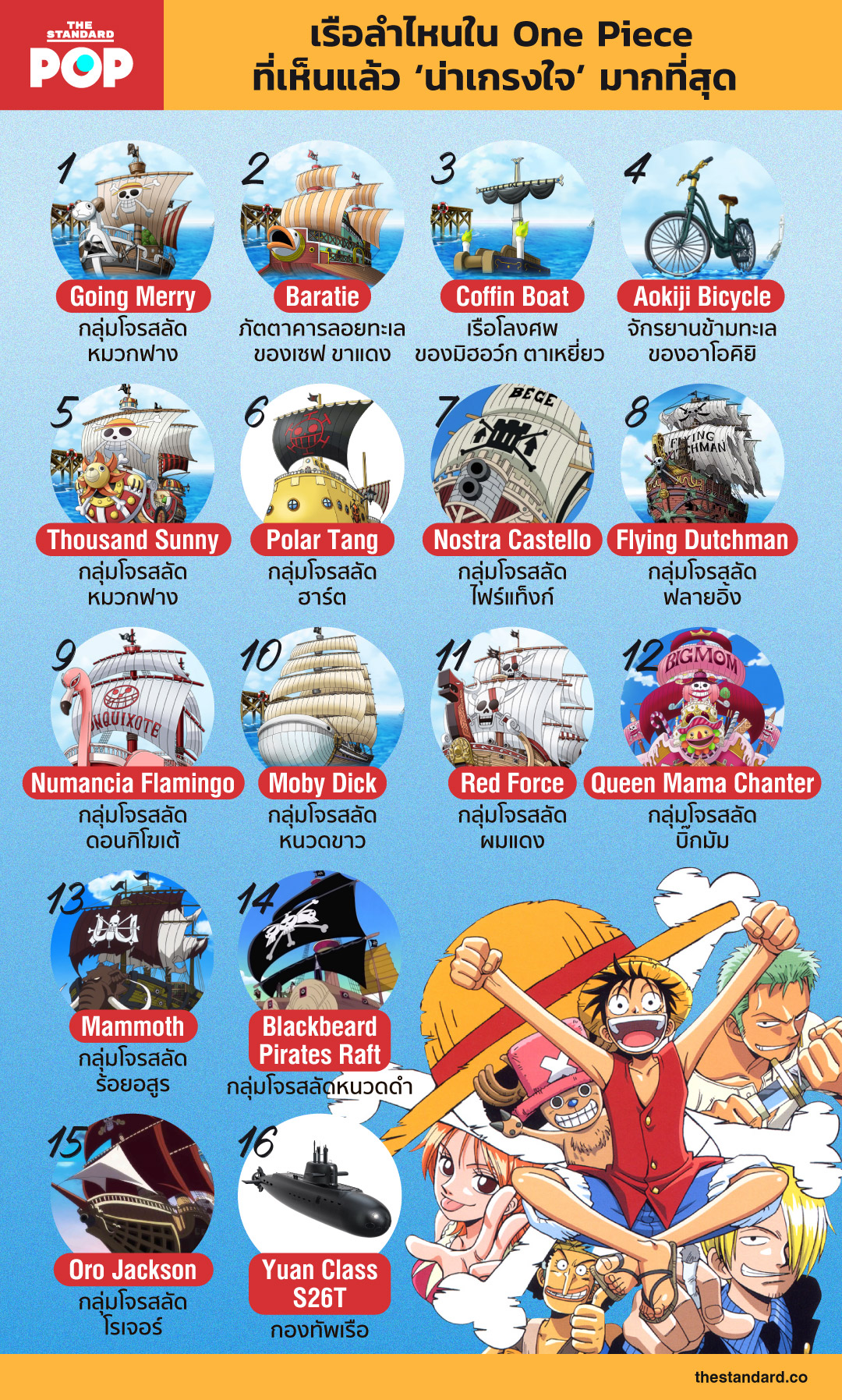 THE STANDARD POP ขอชวนทุกคนมาแลกเปลี่ยนความคิดเห็นว่า เรือโจรสลัดลำไหนที่เห็นแล้วรู้สึก ‘น่าเกรงใจ’ มากที่สุดในเรื่อง One Piece และต้องย้ำอีกครั้งว่า ความยิ่งใหญ่ที่เห็นนั้นอยู่ได้แค่ในโลกแห่งจินตนาการเท่านั้น
