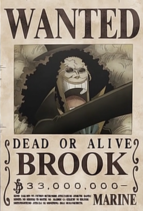 บรูคเป็นผู้ครอบครองพลังผลปีศาจโยมิโยมิ ที่ทำให้วิญญาณสามารถเดินทางกลับจากโลกแห่งความตาย แต่น่าเสียดายเมื่อเขาฟื้นคืนชีพขึ้นมา เพื่อนๆ กลุ่มโจรสลัดรุมบ้าผู้ชื่นชอบและเริงร่าในเสียงดนตรีขนาดที่เด็กร้องไห้ยังต้องหัวเราะ พากันเสียชีวิตไปหมดแล้ว