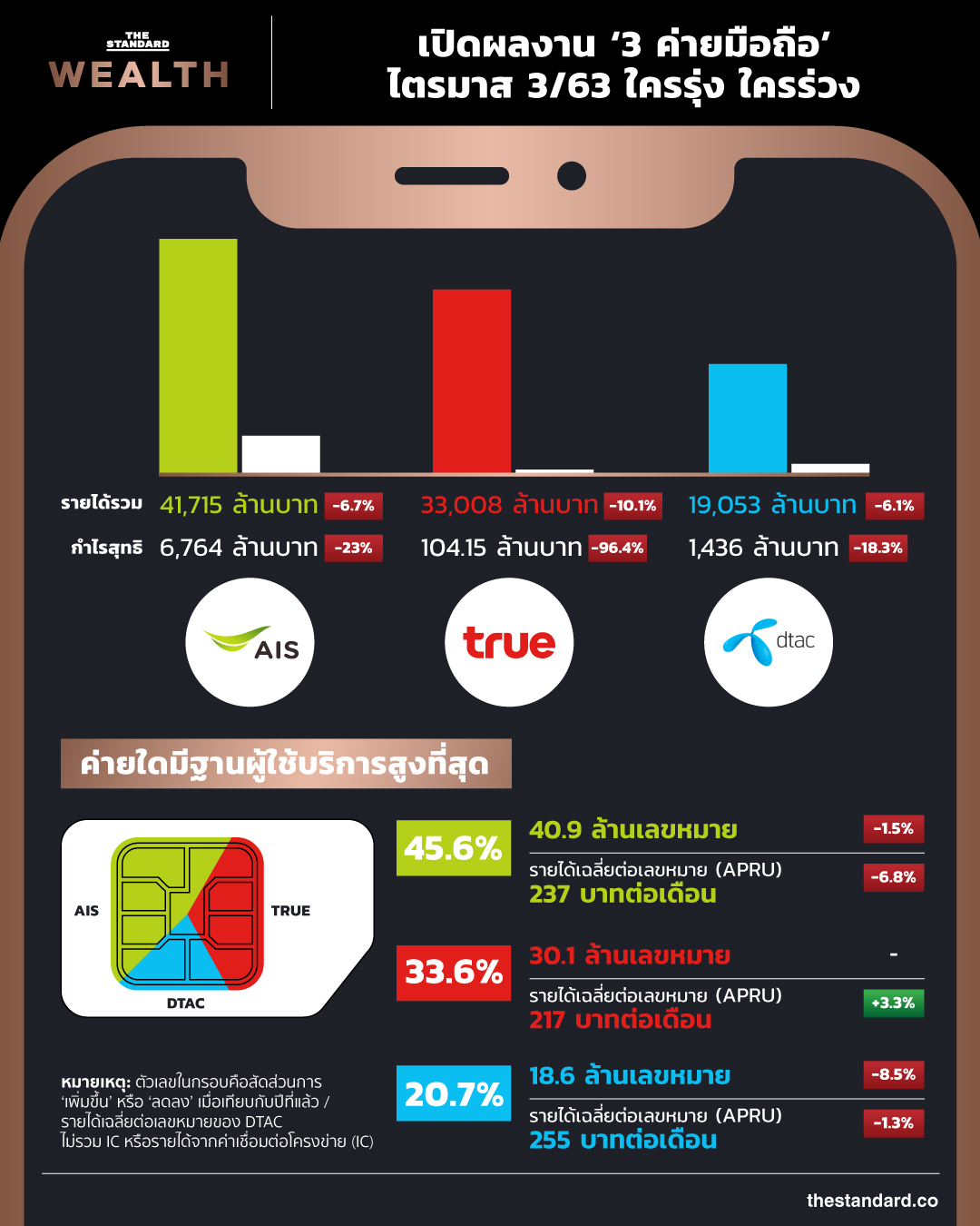 THE STANDARD ชวนคุณมาแกะซิม เช็กสถานการณ์ของผู้ให้บริการทั้ง 3 เจ้า ไปพร้อมๆ กันว่า ภาพรวมการแข่งขันในตอนนี้เป็นอย่างไร รายได้และฐานผู้ใช้บริการของแต่ละค่ายเพิ่มขึ้นหรือลดลงมากน้อยแค่ไหน แล้วโอกาสต่อจากนี้ในการจะเทิร์นตัวเองกลับมาทำผลงานได้อย่างน่าประทับใจ มีมากน้อยเพียงใด