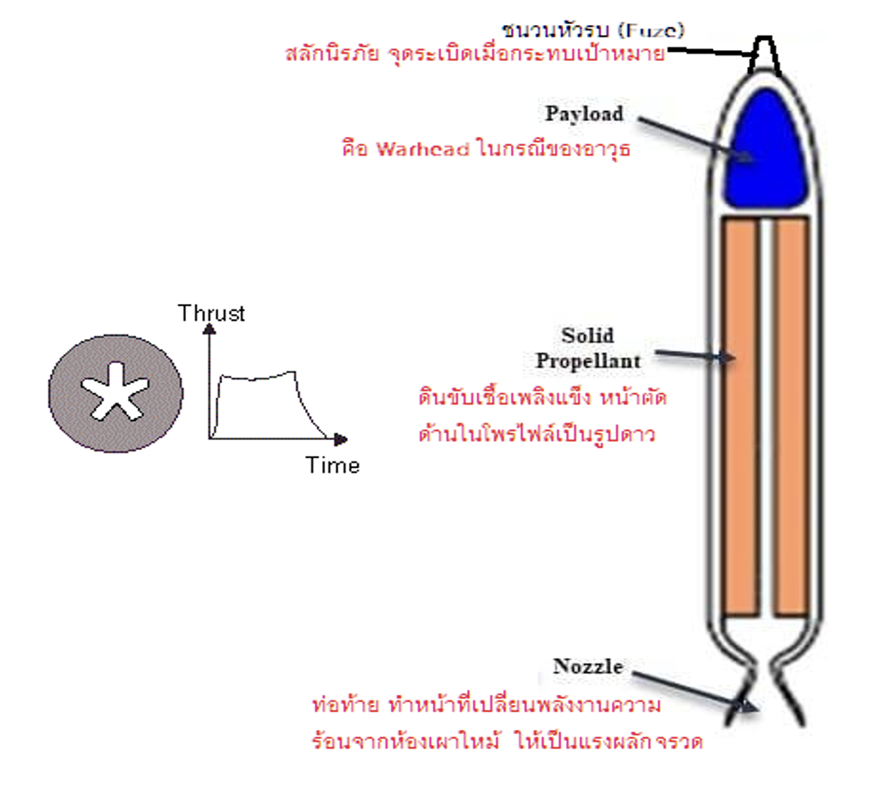 ให้สามารถทนความร้อนเป็นพันองศาเซลเซียสได้ ซึ่งเราเรียกการศึกษาในส่วนนี้ว่า ‘Internal Ballistic’ ซึ่งเช่นกัน ก็ต้องใช้ซอฟต์แวร์ วัสดุ และเครื่องมือพิเศษเป็นจำนวนมากในการพัฒนา ต้องรับถ่ายทอดองค์ความรู้ในระดับ TRL-6 เป็นอย่างต่ำจากประเทศมหาอำนาจ และการออกแบบ External & Internal Ballistic นี้เองถือเป็นจุดเริ่มในการออกแบบคุณลักษณะและประสิทธิภาพของจรวดให้เหมาะกับภารกิจและการใช้งาน – จรวดดินขับเชื้อเพลิงแข็งมักมีแรงผลักช่วงต้นสูง แล้วจะลดลงอย่างรวดเร็ว ในขณะที่จรวดนำส่งทางอวกาศ จะมีแรงผลักช่วงต้นปานกลาง และค่อนข้างคงที่ไปเป็นระยะเวลานาน เป็นต้น