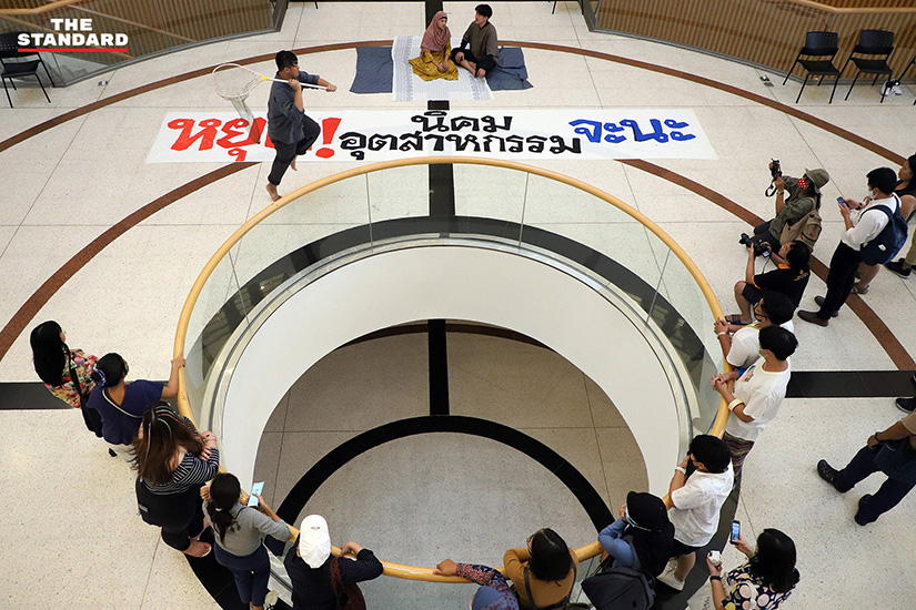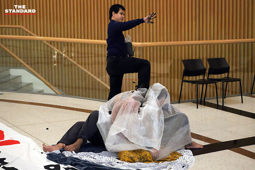หลังจากเสร็จสิ้นกิจกรรมเสวนา ก็มีการแสดงละครสั้นบริเวณหน้าหอศิลปวัฒนธรรมแห่งกรุงเทพมหานคร โดยการแสดงละครสะท้อนถึงวิถีชีวิตของชาวบ้านที่ทำประมงหาปลา แล้ววันหนึ่งก็มีนายทุนเข้ามาในพื้นที่ ข่มขู่ ข่มเหง ใช้อำนาจของเงินโยนใส่และกดขี่ชาวบ้าน แล้วก็ใช้อวนดักปลาหว่านใส่ชาวบ้านไว้ สะท้อนถึงการใช้อำนาจควบคุมชาวบ้าน จากนั้นก็ชูป้ายผ้า ‘หยุด นิคมอุตสาหกรรมจะนะ’ ก่อนที่จะเสร็จสิ้นกิจกรรม