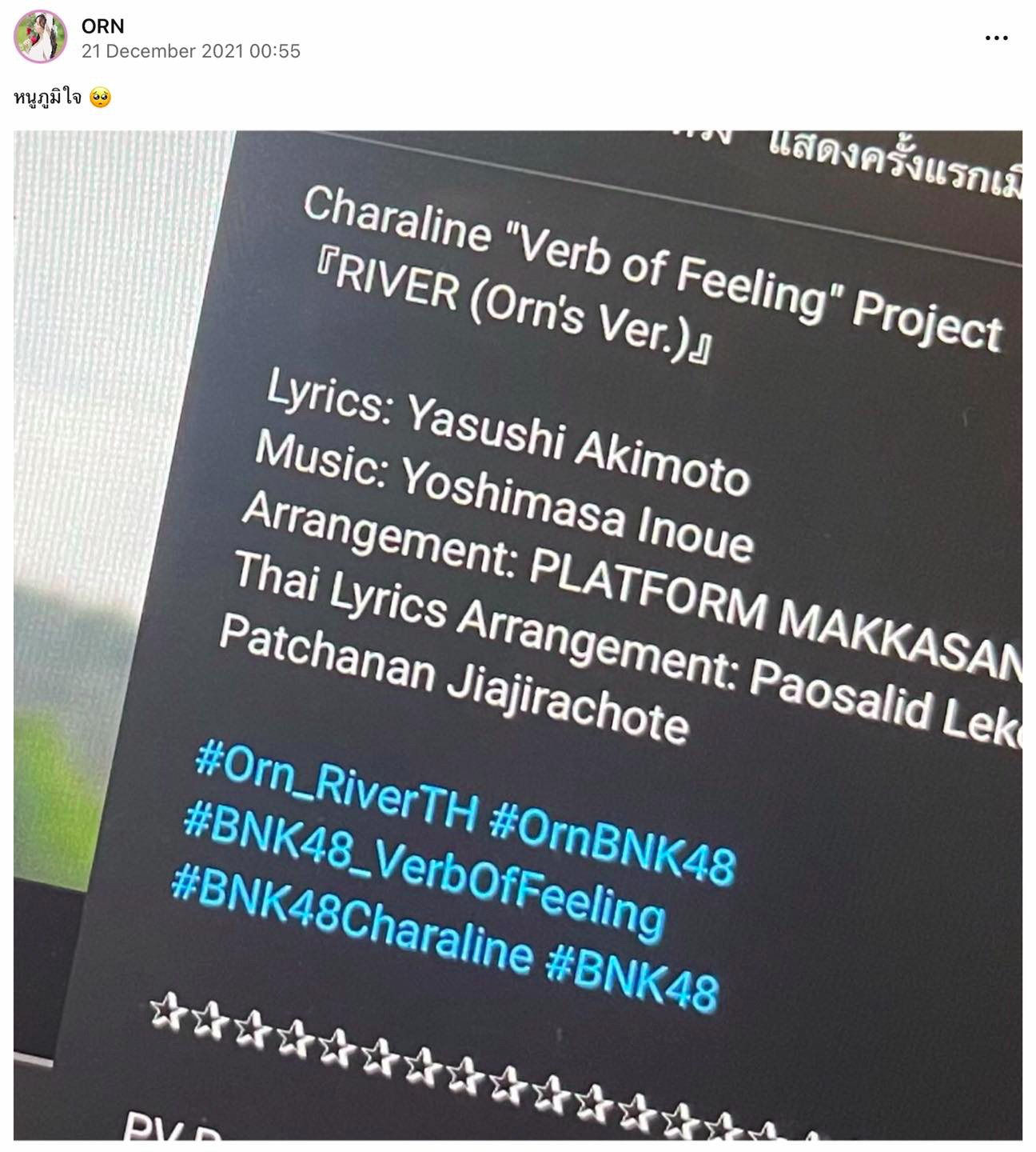 เพลง RIVER คือผลงานจากวงรุ่นพี่ AKB48 ที่ปล่อยออกมาในปี 2009 ก่อนที่ BNK48 จะหยิบมาดัดแปลงเป็นฉบับภาษาไทยในซิงเกิลอัลบั้มชุดที่ 1 ของวงในปี 2018 โดยมีอรมารับตำแหน่งเซ็นเตอร์ และได้ ครูนิค-เภาสฤษดิ์ เล็กชม และ ครูแมน-ตนุภพ โนทยานนท์ มาแปลเนื้อเพลงฉบับภาษาไทย