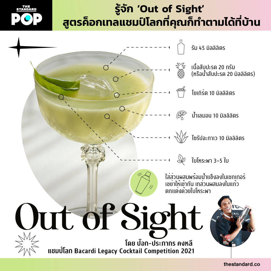 เอกลักษณ์ของการแข่งขันรายการนี้คือบาร์เทนเดอร์จะต้องคิดค้นสูตรค็อกเทลที่มีความเป็นไปได้ที่จะกลายเป็นคลาสสิกค็อกเทลตัวถัดไป ซึ่งคุณสมบัติอย่างหนึ่งคือการที่มันต้องใหม่ ทำง่าย และสามารถทำได้จากที่ไหนก็ได้ทั่วโลก ค็อกเทล ‘Out of Sight’ จึงหยิบวัตถุดิบรอบตัวที่เขาได้แรงบันดาลใจมาจากของโปรดของภรรยาอย่างสับปะรด โยเกิร์ต และโหระพา ทดลองสัดส่วนหลากหลายก่อนเจอสูตรที่เหมาะสม ออกมาเป็นรสชาติใหม่ที่ได้ความหอมของใบโหระพา และความหวานเปรี้ยวของโยเกิร์ตและสับปะรด