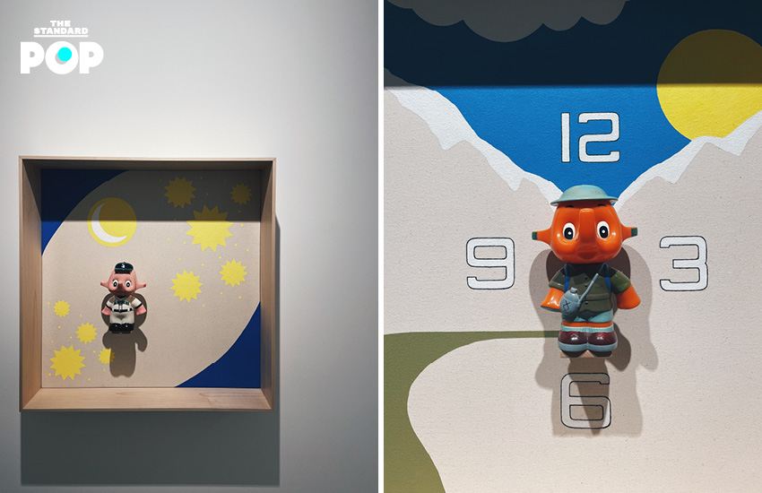 ถัดไปอีกชั้นเป็นงานแสดงที่มาในชื่อ Chateaux Sato ครั้งนี้เป็นประติมากรรมกระปุกออมสินสไตล์ญี่ปุ่น งานวินเทจที่เราเห็นคุ้นตา คราวนี้จำลองแต่ละฉากอยู่ภายในกรอบไม้ พร้อมข้อความ ลวดลายการตกแต่งสื่อเรื่องราวที่ต่างกัน จะเห็นได้ว่าผลงานทุกชิ้นของเขาผสานความเป็นอิตาเลียนและญี่ปุ่นเอาไว้ได้อย่างน่าสนใจ