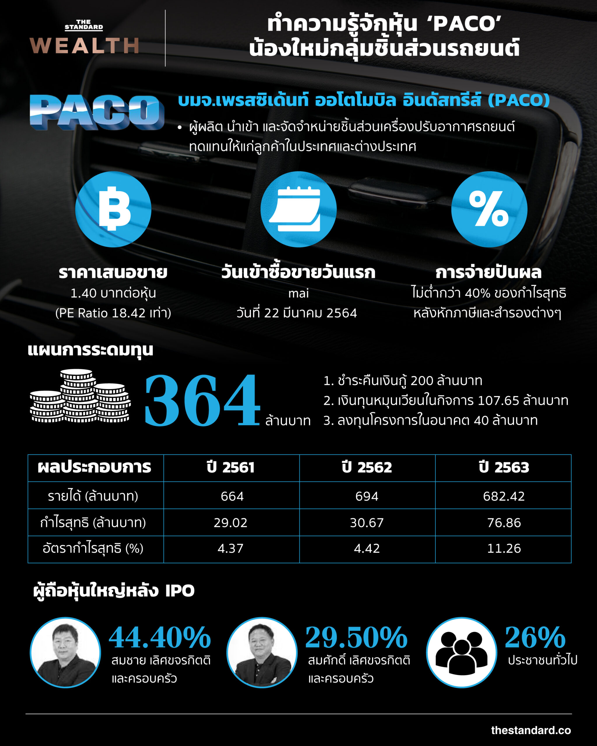 หุ้นน้องใหม่ IPO ‘PACO’ ผู้ผลิตและจัดจำหน่ายชิ้นส่วนเครื่องปรับอากาศ ซึ่งเป็นฟันเฟืองสำคัญในรถยนต์ เตรียมเข้าซื้อขายในตลาดหลักทรัพย์ mai วันแรก 22 มีนาคมนี้ ด้วยราคาไอพีโอ 1.40 บาท หวังนำเงินระดมทุนชำระคืนเงินและลงทุนในอนาคต