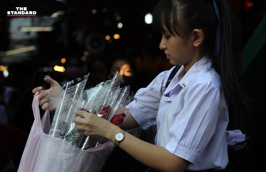 บรรยากาศปากคลองตลาดก่อนวันวาเลนไทน์ค่อนข้างคึกคัก โดยมีนักเรียน นักศึกษา และผู้ค้ารายย่อยเดินทางมาเลือกซื้อดอกกุหลาบ มีทั้งแบบสำเร็จรูปที่ถูกจัดไว้เรียบร้อยแล้ว และแบบเป็นดอกสีสันต่างๆ ให้เลือกซื้อในหลายราคา โดยปีนี้ราคาดอกกุหลาบมีการปรับเพิ่มตามต้นทุนการขนส่งที่เพิ่มขึ้น