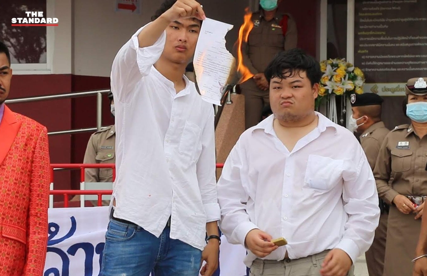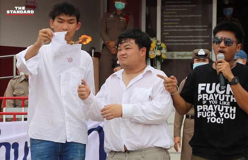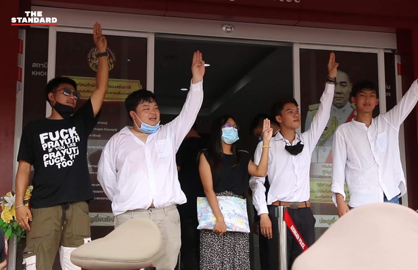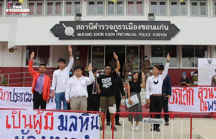 วันนี้ (10 กันยายน) ที่สถานีตำรวจภูธร (สภ.) เมืองขอนแก่น จตุภัทร์ บุญภัทรรักษา หรือ ไผ่ ดาวดิน พร้อมด้วย ปิยดา มาเทียน หรือ เฟรม, ธนภณ เดิมทำรัมย์ หรือ อาร์ตยุ่น, วชิรวิทย์ เทศศรีเมือง หรือ เซฟ, พริษฐ์ ชิวารักษ์ หรือ เพนกวิน และ ปติวัฒน์ สาหร่ายแย้ม หรือ หมอลำเเบงก์ เดินทางเข้ารายงานตัวตามหมายเรียกของสภ.เมืองขอนแก่น โดยก่อนการรายงานตัวนั้น พริษฐ์ หรือ เพนกวิน แกนนำสหภาพนักเรียน นิสิต นักศึกษาแห่งประเทศไทย ได้เผาหมายเรียกของเจ้าหน้าที่ตำรวจ เพื่อแสดงออกถึงการกดขี่ ความไม่ยุติธรรมในการแจ้งข้อกล่าวหา ที่ใช้ พ.ร.ก. ฉุกเฉิน มาควบคุมสิทธิเสรีภาพของประชาชน