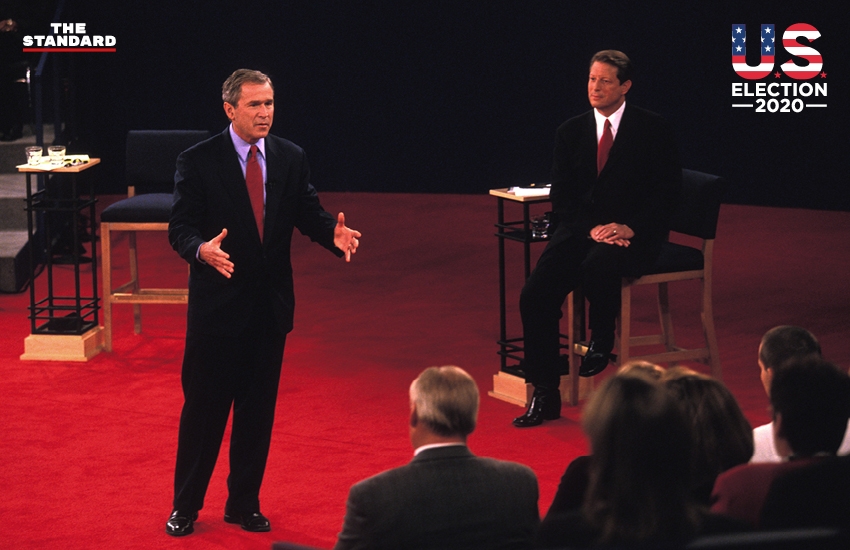 การเลือกตั้งในปี 2000 เป็นการแข่งขันกันระหว่าง อัล กอร์ ที่ขณะนั้นเป็นรองประธานาธิบดีของคลินตันมา 8 ปีกับ จอร์จ บุช ผู้ลูก ซึ่งดำรงตำแหน่งผู้ว่าการรัฐเท็กซัสอยู่ ก่อนหน้าที่จะมีการดีเบต นักวิเคราะห์ทางการเมืองทุกคนมองตรงกันว่ากอร์น่าจะต้อนบุชเข้ามุมได้แน่ๆ เพราะกอร์มีประสบการณ์การเมืองในระดับชาติและการต่างประเทศมานับสิบปี ในขณะที่บุชมีประสบการณ์แค่การเมืองระดับมลรัฐเท่านั้น ซึ่งแม้แต่กอร์เองก็คงคิดแบบนั้น เพราะระหว่างบุชตอบคำถาม กอร์มักจะถอนหายใจออกมาดังๆ พร้อมทั้งกลอกตาไปมา ราวกับจะสื่อว่าคำตอบของบุชช่างไม่ฉลาดเหลือเกิน ซึ่งภาพที่ออกไปนี้กลายเป็นผลเสียต่อกอร์แทน เพราะมันเป็นภาพของคนเย่อหยิ่ง จองหอง ที่คิดว่าตัวเองฉลาดกว่าคนอื่น ทำให้คะแนนนิยมในแง่ความชอบในฐานะบุคคล (Likability) ของกอร์ลดลง