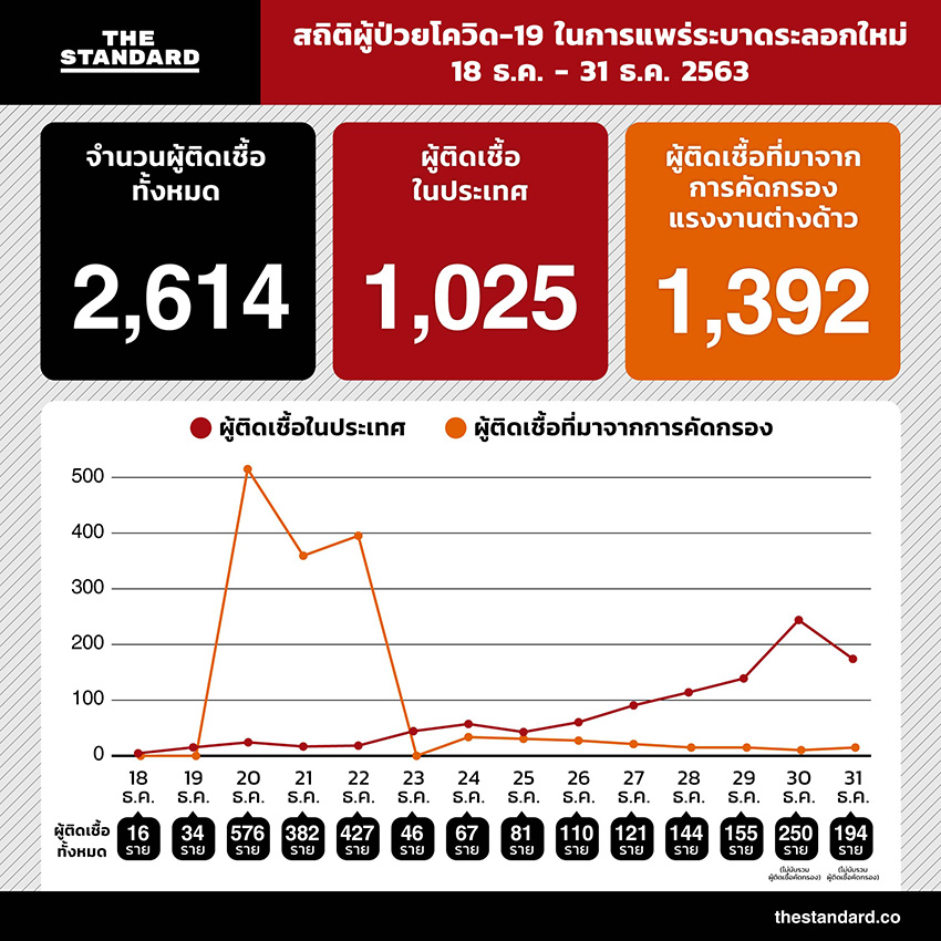 THE STANDARD เปิดจำนวนผู้ติดเชื้อโควิด-19 ในระลอกใหม่ นับแต่วันที่ 18 ธันวาคม 2563 ซึ่งเป็นวันแรกที่ ศบค. รายงานว่ามีผู้ติดเชื้อในประเทศ