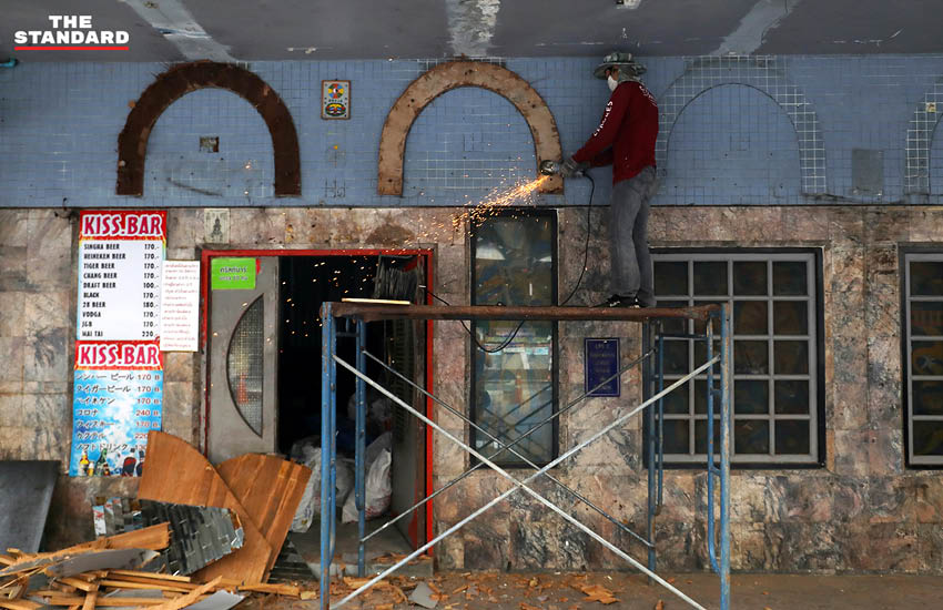 คนงานกำลังรื้อถอนบาร์แห่งหนึ่งบนถนนพัฒน์พงศ์ ย่านบันเทิงยามราตรีของกรุงเทพมหานคร หลังจากที่ผู้เช่าสถานที่ไม่ได้ทำการเช่าต่อ เนื่องจากผลกระทบจากการแพร่ระบาดของโควิด ทำให้ย่านพัฒน์พงศ์เงียบเหงามาร่วม 2 ปีแล้ว