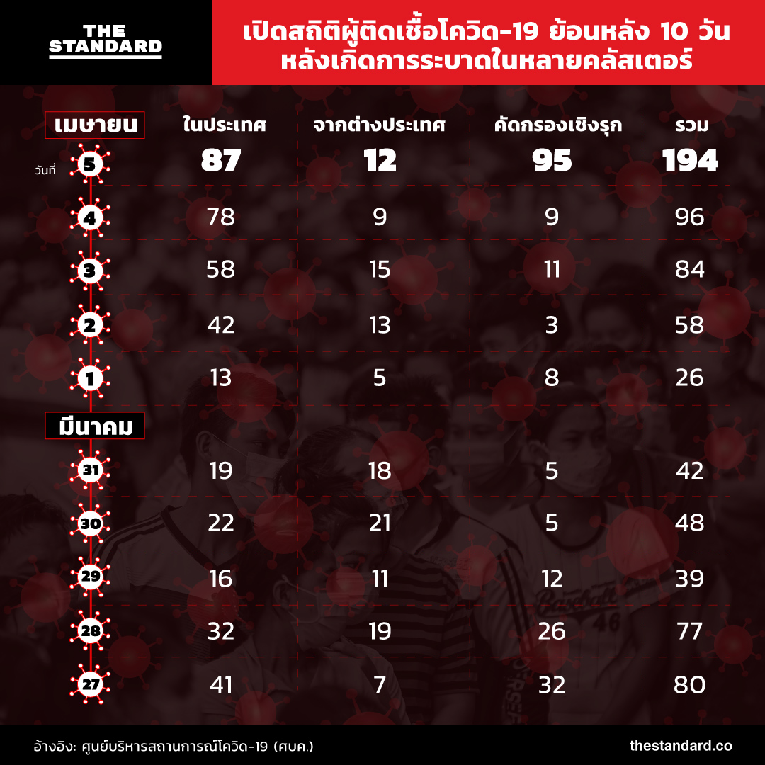 THE STANDARD เปิดสถิติผู้ติดเชื้อโควิด-19 ย้อนหลัง 10 วัน ตั้งแต่วันที่ 27 มีนาคม ถึง 5 เมษายน