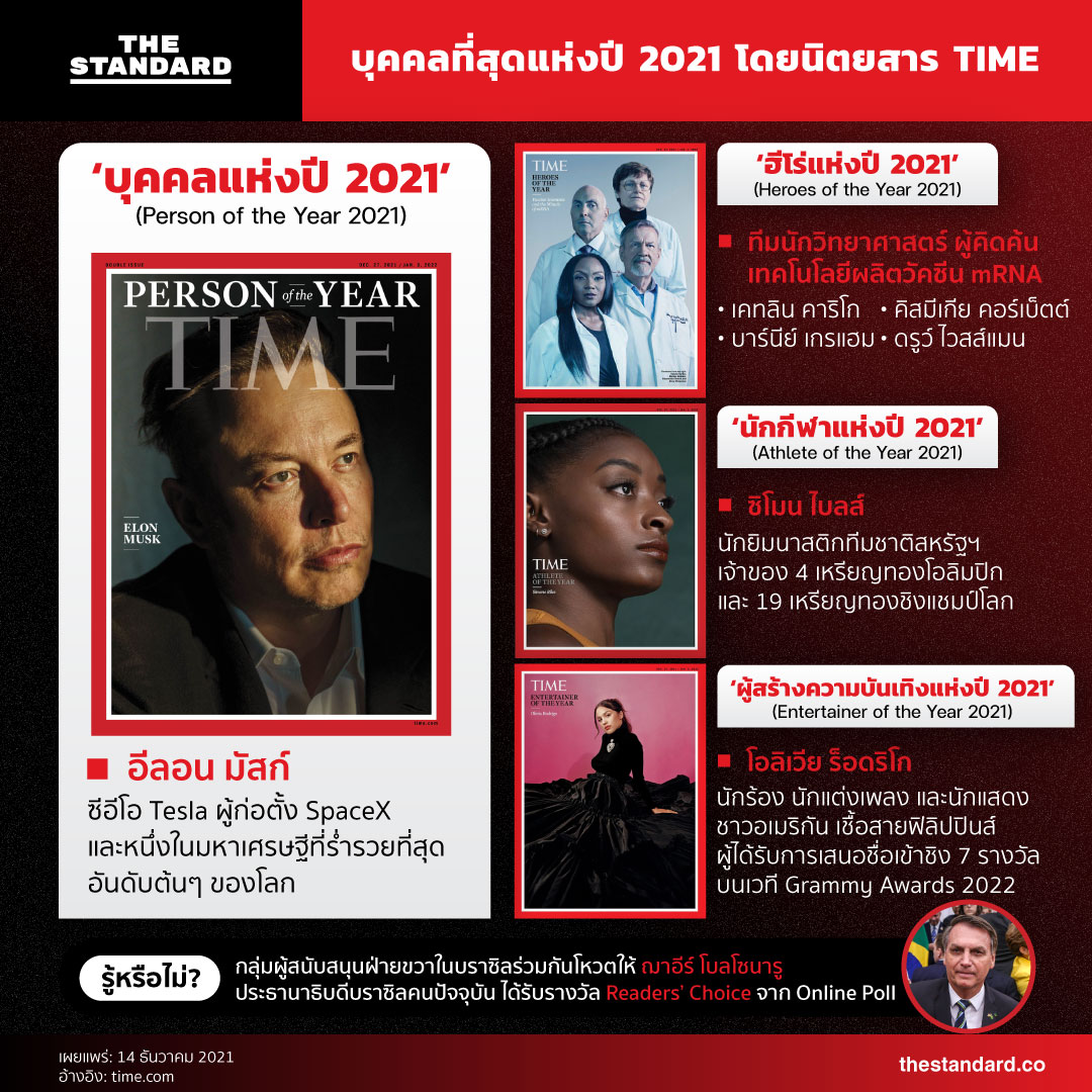 - นิตยสาร Time ยก อีลอน มัสก์ เป็นบุคคลแห่งปี 2021 ชี้บทบาทขับเคลื่อนความเปลี่ยนแปลงและมีอิทธิพลต่อชีวิตบนโลกและนอกโลก