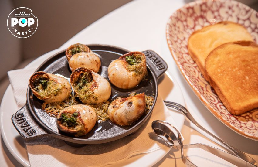 ถ้านี่คือก้าวแรกสู่โลกแห่งอาหารฝรั่งเศสของคุณ เราก็อยากให้คุณได้ลอง Escargots (390 บาท) สิ่งนี้คือหอยทากอบเนยกระเทียมสมุนไพร ที่มาพร้อมอุปกรณ์การกิน ทั้งที่คีบและส้อมอันเล็กสำหรับดึงเนื้อหอยทากออกมา แม้ว่าตอนมีชีวิตหอยทากอาจจะดูไม่ได้น่าสนใจอะไร แต่เมื่อเอามาอบเนยกระเทียมแล้ว เราก็พบว่าหอยทากเป็นอาหารที่รสชาติดีทีเดียว ลองกินทั้งแบบเดี่ยวและคู่กับขนมปังก็ดีไปอีกแบบ