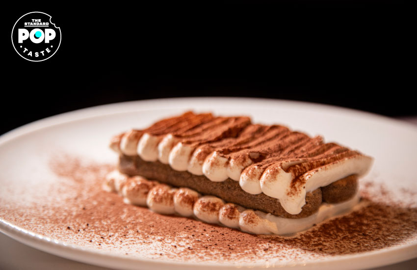 ปิดท้ายด้วย Tiramisu ขนมคอมฟอร์ตของประเทศแถบชายฝั่งทะเลเมดิเตอร์เรเนียนที่ใช้บิสกิตเลดี้ฟิงเกอร์ชุบในกาแฟจนชุ่ม ตามด้วยชีสมาสคาร์โปเนเนื้อแน่น โรยด้วยผงโกโก้เพิ่มกลิ่นหอมหวาน ทางร้านดีไซน์ขนมนี้ให้ออกมาไม่เหมือนร้านไหนด้วยรูปร่างแบน และการบีบมาสคาร์โปเนลงไปให้เป็นเส้นสวยงาม ถือเป็นเมนูปิดท้ายมื้อที่ลงตัวทีเดียว