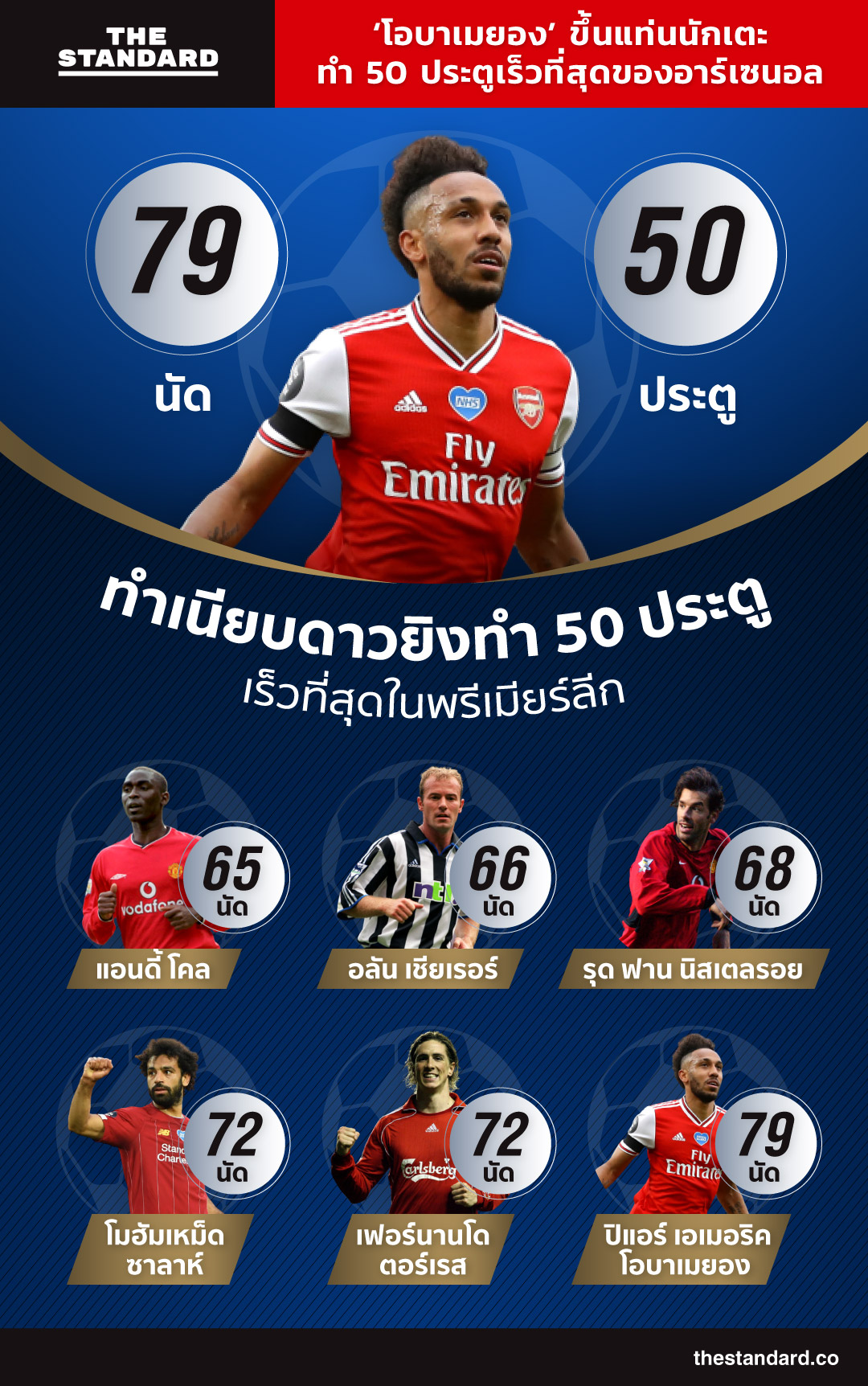 สำหรับนักเตะศูนย์หน้าของทีมอาร์เซนอลอย่าง ปิแอร์ เอเมอริค โอบาเมยอง ที่กด 2 ประตูในเกมดังกล่าว พร้อมขึ้นแท่นกลายเป็นนักเตะที่ทำได้ 50 ประตู จากการลงเตะ 79 นัด ถือว่าเร็วที่สุดในประวัติศาสตร์ของทีมอาร์เซนอล แทนที่สถิติเดิมของ เธียร์รี อองรี ที่ใช้เวลา 87 นัด ได้สำเร็จ