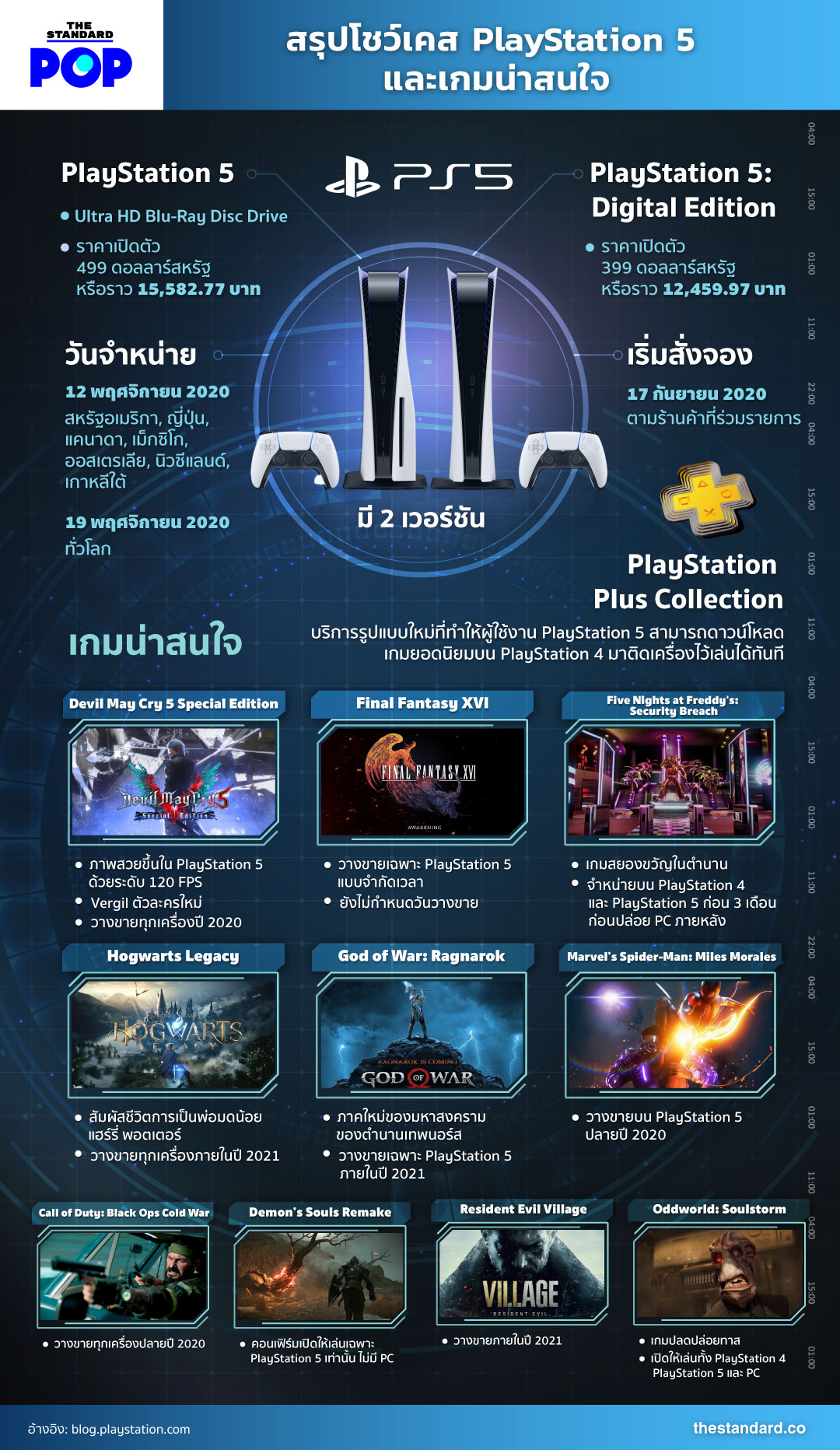 หลังจากงานโชว์เคสของ PlayStation 5 ที่จบลงไปแล้วเมื่อคืนทำให้คอเกมคอนโซลหลายคนใจร้อนฉ่า อยากซื้อหา PlayStation 5 มาครอบครองอย่างรวดเร็ว โดยราคาเปิดตัวอยู่ที่ 15,582.77 บาท สำหรับเวอร์ชันปกติ และราว 12,459.97 บาท สำหรับดิจิทัลเวอร์ชัน ส่วนจะเข้าไทยในราคาเท่าไรนั้น คาดว่าคงไม่หนีกันมาก นอกจากราคาและตัวคอนโซลที่มีรูปลักษณ์โฉบเฉี่ยว เกมที่นำมาเปิดตัวในงานก็ชวนขนลุก น่าซื้อมาเช่นกัน ไม่ว่าจะเป็น God of War: Ragnarok ที่แม้โผล่มาเพียงไตเติลเพียงภาพเดียว แต่ก็เรียกเสียงฮือฮาได้มาก หรือ Hogwarts Legacy เกมใหม่ที่นำคุณมาสู่โลกแห่งเวทมนตร์แบบสมจริง ชนิดที่ว่าเล่นสนุกทั้งเด็กและผู้ใหญ่ ไม่ใช่เกมไก่กาอาราเล่แน่นอน สำหรับใครที่ยังจับต้นชนปลายไม่ถูก THE STANDARD POP สรุปรายละเอียดโดยรวมมาให้แล้ว จบในโพสต์เดียว รู้เรื่อง!
