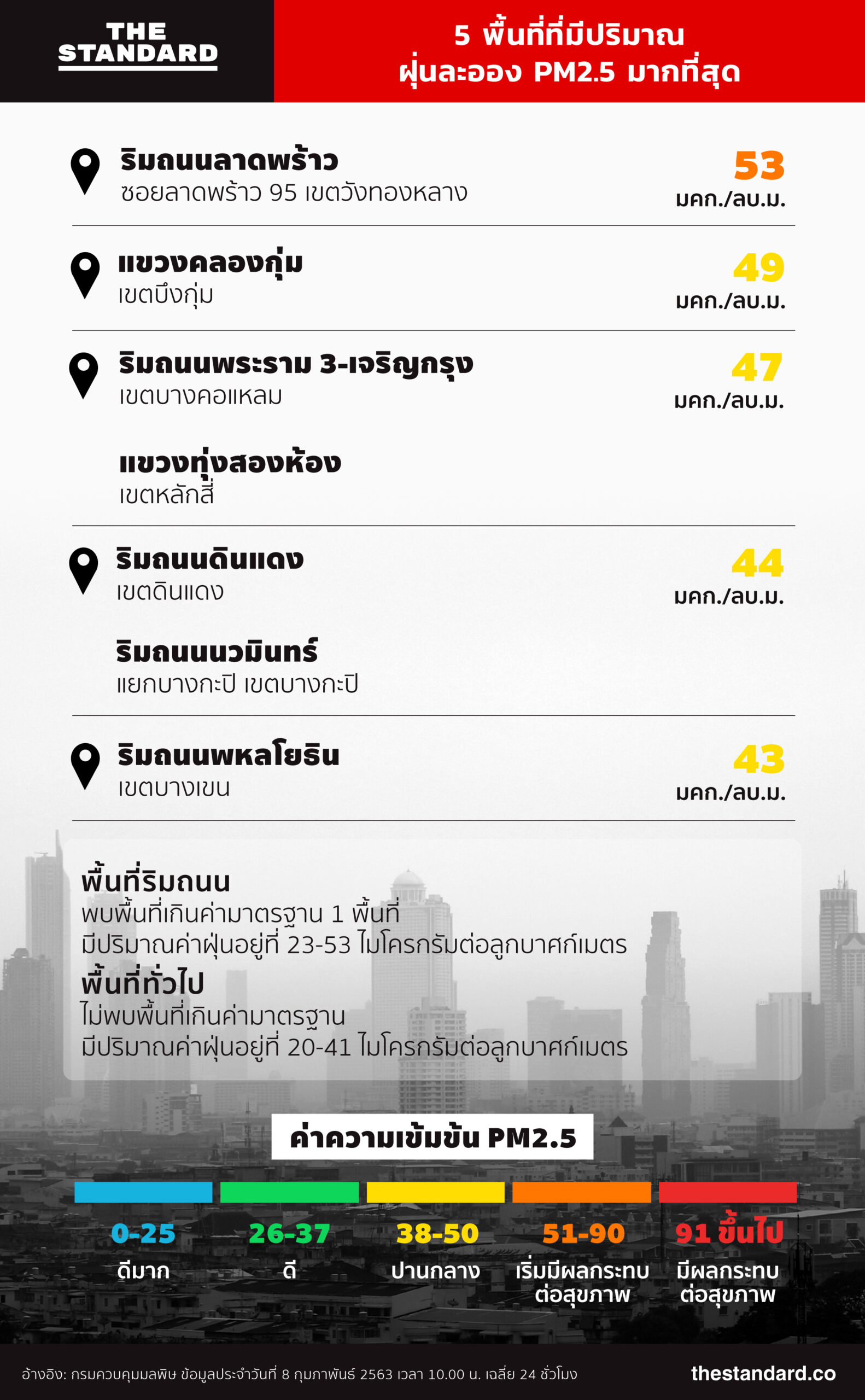 สถานการณ์ฝุ่นละออง PM2.5 ในพื้นที่เขตกรุงเทพมหานครและปริมณฑลมีปริมาณเพิ่มขึ้นเล็กน้อยเมื่อเทียบกับวานนี้ในช่วงเวลาเดียวกัน โดยพบพื้นที่เกินมาตรฐาน 1 จุดคือ ริมถนนลาดพร้าว ซอยลาดพร้าว 95 เขตวังทองหลาง