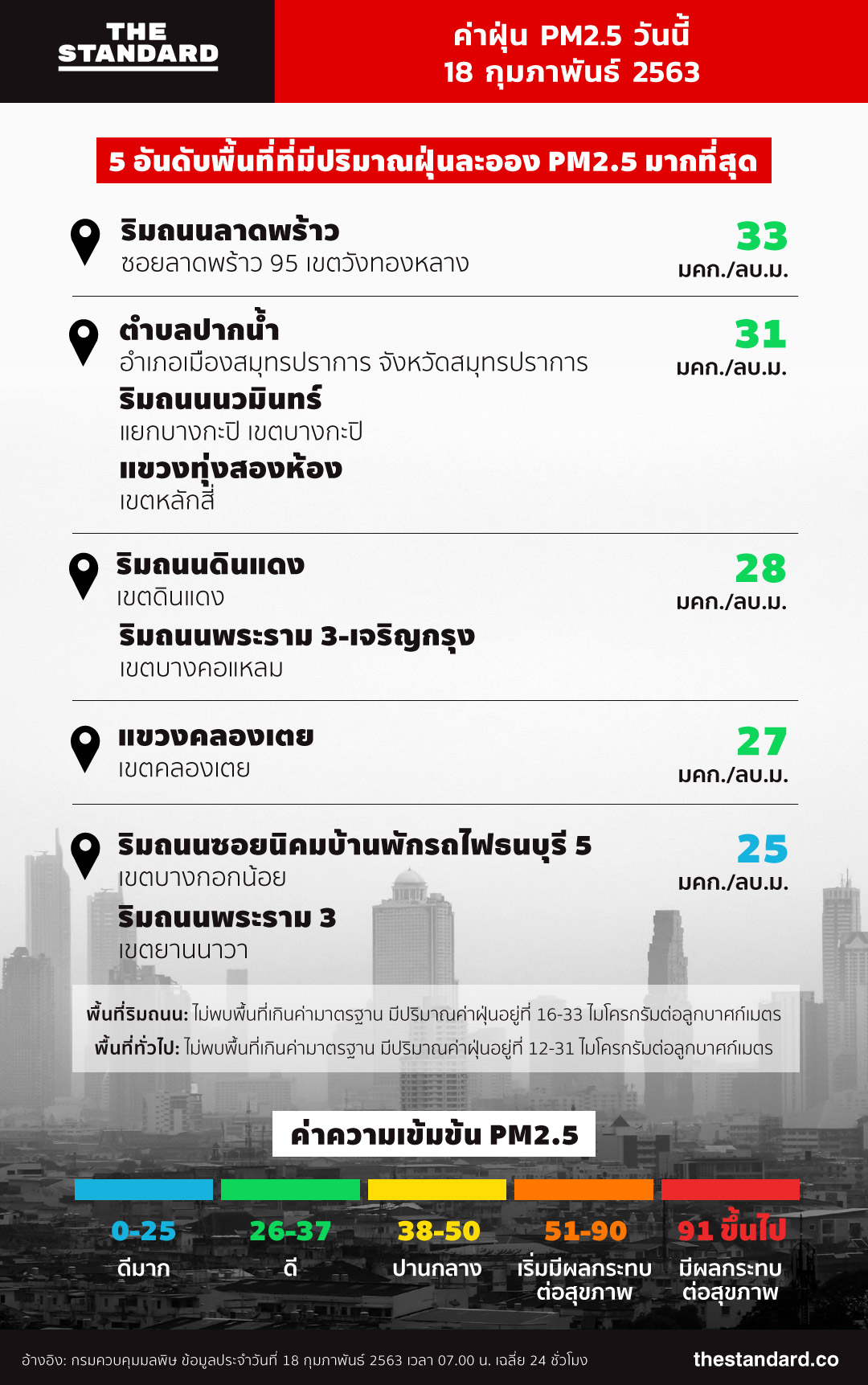 สถานการณ์ฝุ่นละออง PM2.5 ในพื้นที่เขตกรุงเทพมหานครและปริมณฑลมีปริมาณเพิ่มขึ้นเล็กน้อยเมื่อเทียบกับวานนี้ในช่วงเวลาเดียวกัน แต่ยังไม่พบพื้นที่เกินมาตรฐานแม้แต่ที่เดียว โดยสาเหตุเกิดจากลมตะวันออกเฉียงใต้ยังคงพัดปกคลุมภาคกลาง รวมทั้งกรุงเทพมหานครและปริมณฑล ทำให้การสะสมของฝุ่นละอองหรือหมอกควันเพิ่มขึ้นไม่มาก และยังคงมีสะสมอยู่บนอากาศ