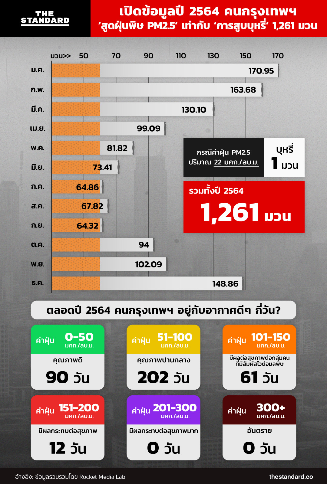 พบว่า ตลอดปี 2564 ที่ผ่านมา คนกรุงเทพฯ สูดฝุ่นพิษ PM2.5 เข้าปอด ซึ่งเทียบเท่ากับการสูบบุหรี่มากถึง 1,261 มวน นอกจากนี้ยังพบว่าปีที่ผ่านมา กรุงเทพฯ มีคุณภาพอากาศอยู่ในระดับสีแดง หมายถึงมีผลกระทบต่อสุขภาพ มากถึง 12 วัน และอยู่ในระดับสีส้ม หรือมีผลต่อสุขภาพต่อกลุ่มคนที่มีสัมผัสไวต่อมลพิษ 61 วัน โดยสามารถอ่านข้อมูลของ Rocket Media Lab ตามอินโฟกราฟิกด้านล่างนี้