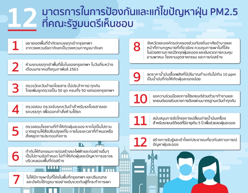 ก่อนอื่นคงต้องดูที่มาตรการจากรัฐบาลกันก่อน ซึ่งในช่วงวิกฤตฝุ่นเดือนมกราคมที่ผ่านมา รัฐบาลประกาศมาตรการฉุกเฉินรับมือฝุ่น PM2.5 ออกมา 12 ข้อ