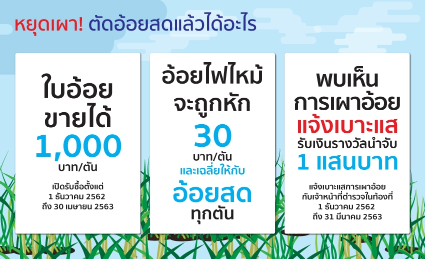 - รณรงค์ประชาสัมพันธ์ร่วมกับหน่วยงานระดับจังหวัด หน่วยงานระดับท้องถิ่นจากภาครัฐและเอกชน รวมถึงสมาคมชาวไร่อ้อยทั่วประเทศที่ให้ความรู้ชาวไร่เกี่ยวกับประโยชน์และวิธีการตัดอ้อยสด สะอาด งดการเผาอ้อย และมีการตั้งเงินรางวัลนำจับผู้ที่ลักลอบเผาถึง 100,000 บาท
