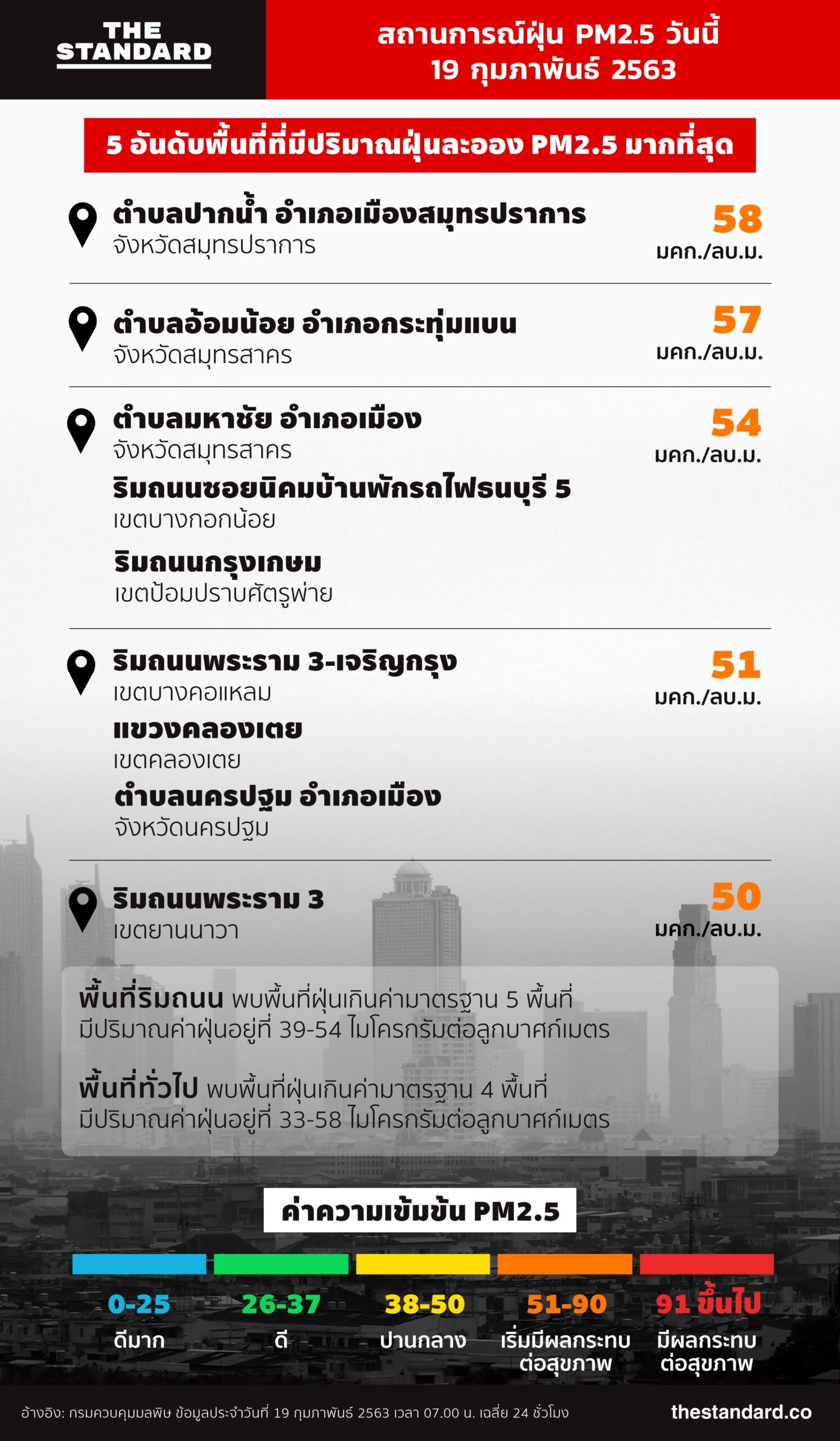 สถานการณ์ฝุ่นละออง PM2.5 ในพื้นที่เขตกรุงเทพมหานครและปริมณฑลมีปริมาณเพิ่มขึ้นเมื่อเทียบกับวานนี้ในช่วงเวลาเดียวกัน โดยพื้นที่ฝุ่นเกินค่ามาตรฐานส่วนใหญ่จะอยู่ในเขตปริมณฑล