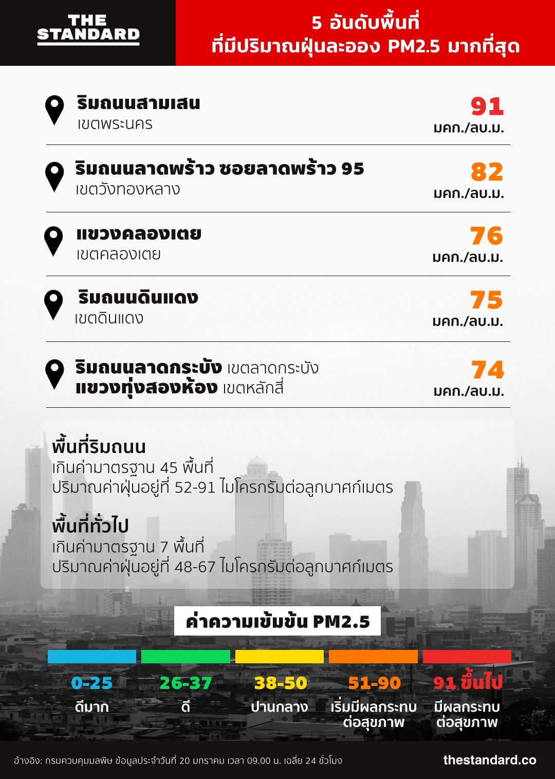 สถานการณ์ฝุ่นละออง PM2.5 ในพื้นที่เขตกรุงเทพมหานครและปริมณฑลมีปริมาณเพิ่มสูงมากหลายพื้นที่ เมื่อเทียบกับวานนี้ในช่วงเวลาเดียวกัน โดยพบพื้นที่ริมถนนฝุ่นเกินมาตรฐาน 45 พื้นที่ และพื้นที่เขตปริมณฑลอีก 7 พื้นที่