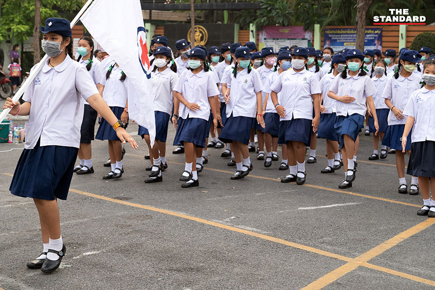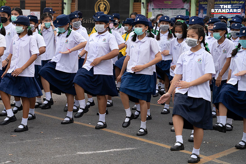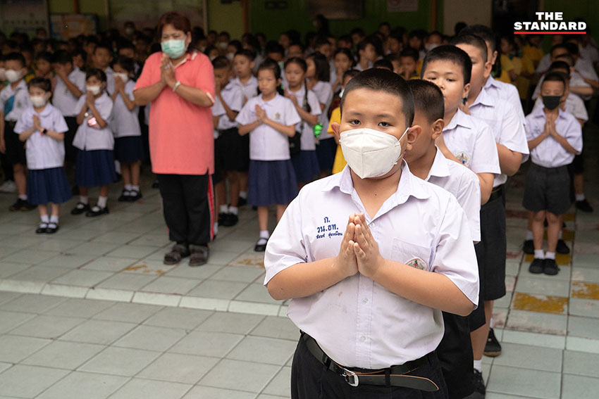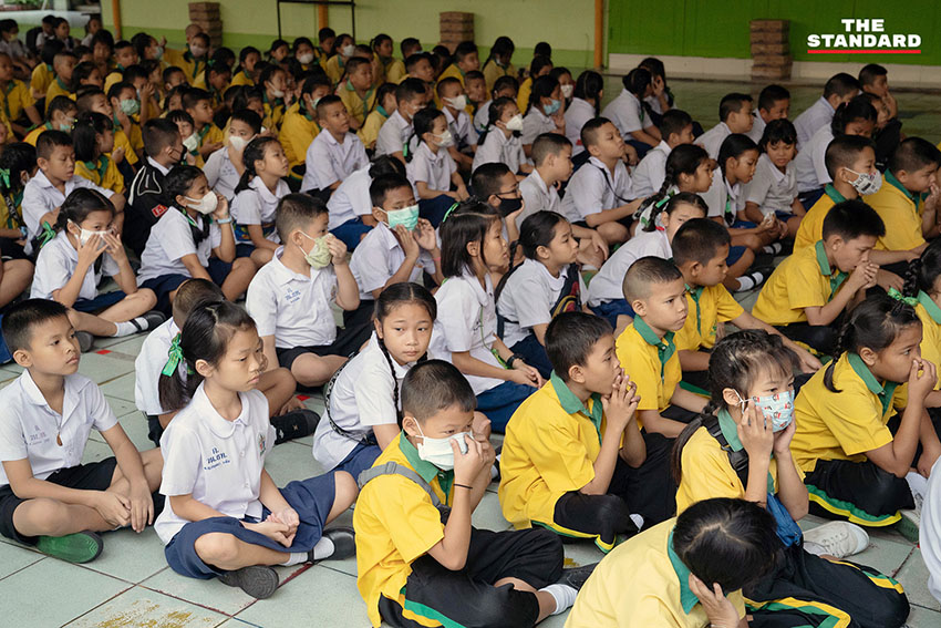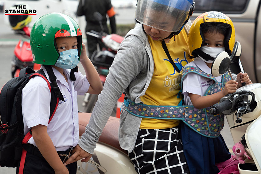 ฝุ่น PM2.5 ยังคงเป็นปัญหากวนใจ และบ่อนทำลายสุขภาพของคนกรุงเทพฯ อย่างต่อเนื่อง ช่วงเช้าที่ผ่านมา THE STANDARD ลงพื้นที่โรงเรียนวัดธาตุทอง (เรือนเขียวสะอาด) ในเขตวัฒนา ซึ่งเด็กชั้นประถมศึกษายังคงต้องมาโรงเรียนเช่นเดียวกับเช้าวันอื่นๆ แต่สิ่งที่เปลี่ยนแปลงไปคือหน้ากากกันฝุ่นที่กลายเป็นอุปกรณ์จำเป็นที่ต้องพกติดตัวก่อนออกจากบ้านมาโรงเรียน โดยพบว่านักเรียนกว่า 60% สวมใส่หน้ากากป้องกันฝุ่น