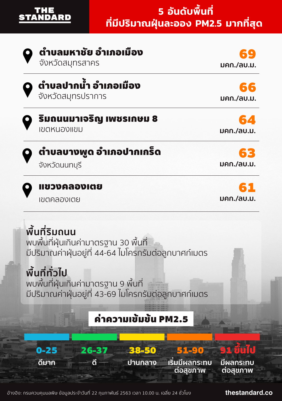 สถานการณ์ฝุ่นละออง PM2.5 ในพื้นที่เขตกรุงเทพมหานครและปริมณฑลยังมีปริมาณคงที่เมื่อเทียบกับวานนี้ในช่วงเวลาเดียวกัน ส่วนสาเหตุที่ฝุ่นก่อตัวเยอะขึ้นเป็นเพราะตลอดหลายวันที่ผ่านมาพื้นที่เขตกรุงเทพฯ และปริมณฑลมีการจราจรติดขัดในหลายเส้นทาง ประกอบกับสภาพอุตุนิยมวิทยามีลมอ่อนในหลายพื้นที่ตั้งแต่ช่วงเช้า ทำให้มีการสะสมของฝุ่นละอองและหมอกควันเพิ่มขึ้นในช่วงนี้