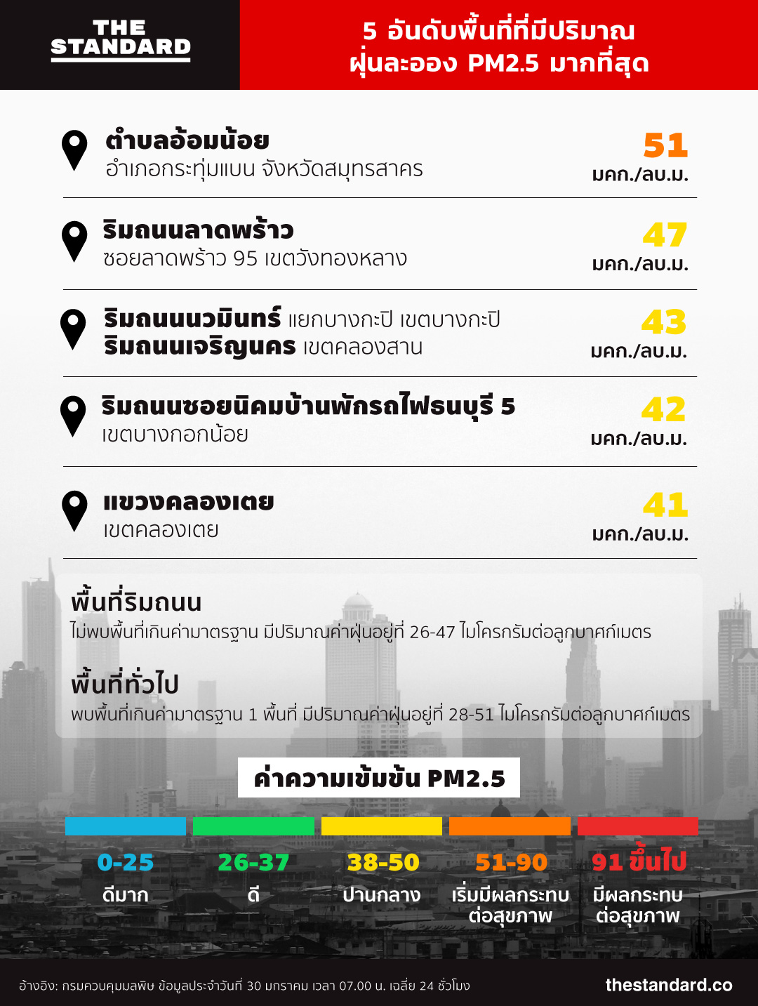 สถานการณ์ฝุ่นละออง PM2.5 ในพื้นที่เขตกรุงเทพมหานครและปริมณฑลเริ่มกลับมามีปริมาณเพิ่มขึ้นเมื่อเทียบกับวานนี้ในช่วงเวลาเดียวกัน โดยเฉพาะพื้นที่ทั่วไป (เขตปริมณฑล) ที่พบพื้นที่เกินมาตรฐานแล้ว 1 จุด คือ ตำบลอ้อมน้อย อำเภอกระทุ่มแบน จังหวัดสมุทรสาคร